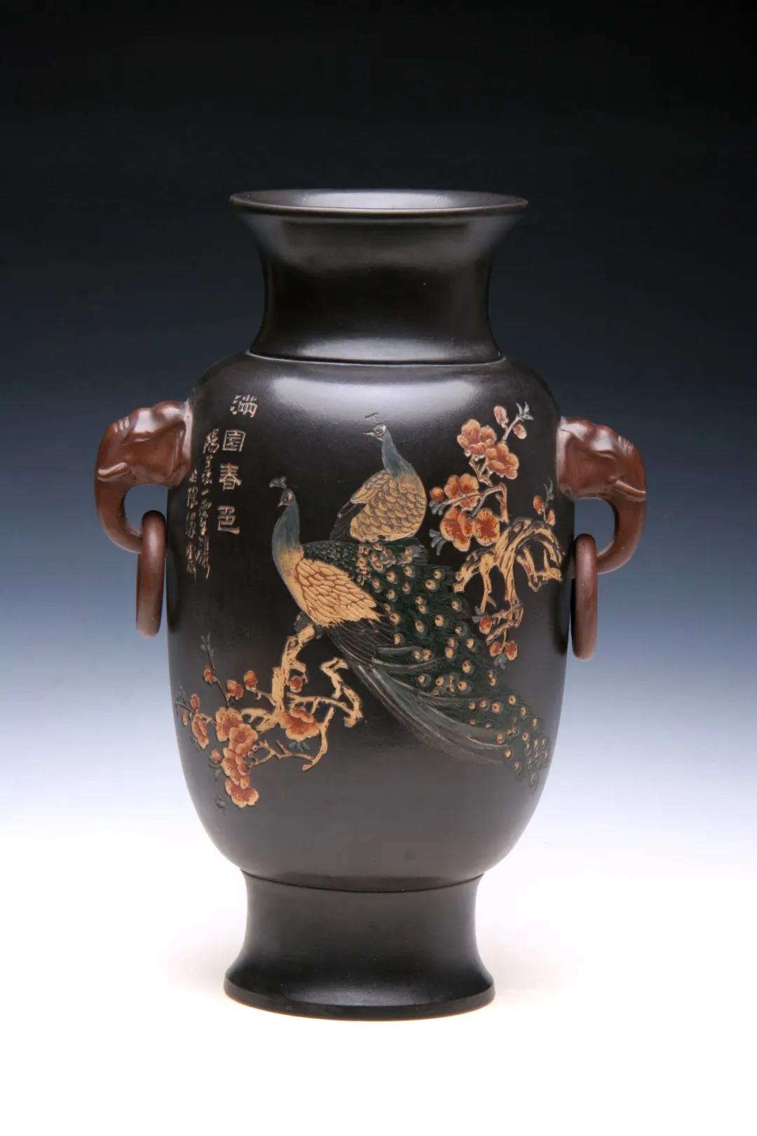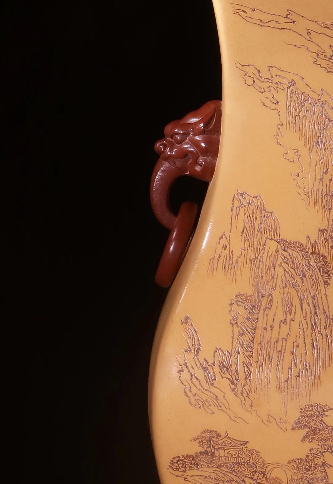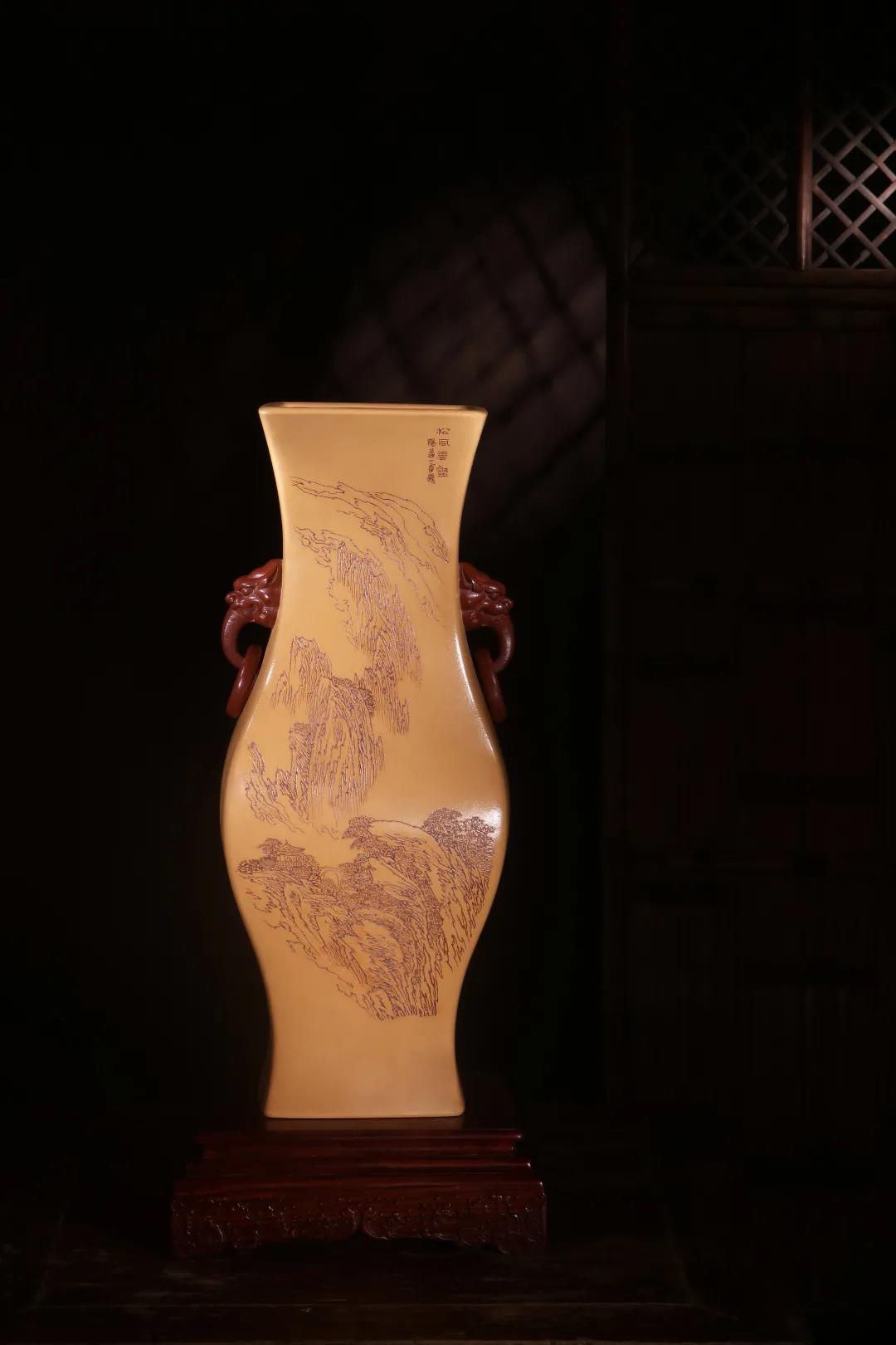 作品造型簡潔明快,線條流暢,端莊渾厚。瓶身刻蒼茫巨壑,深谷危巖,氣勢恢宏,富有張力。作者立身在畫面外,存心于畫面中的造境,立意要“不落古人窠臼”,追求但也不盲從流行的風(fēng)尚,化古為今,在用筆用刀的氣勢和意韻中,將個(gè)人的品質(zhì)融進(jìn)藝術(shù)創(chuàng)作。