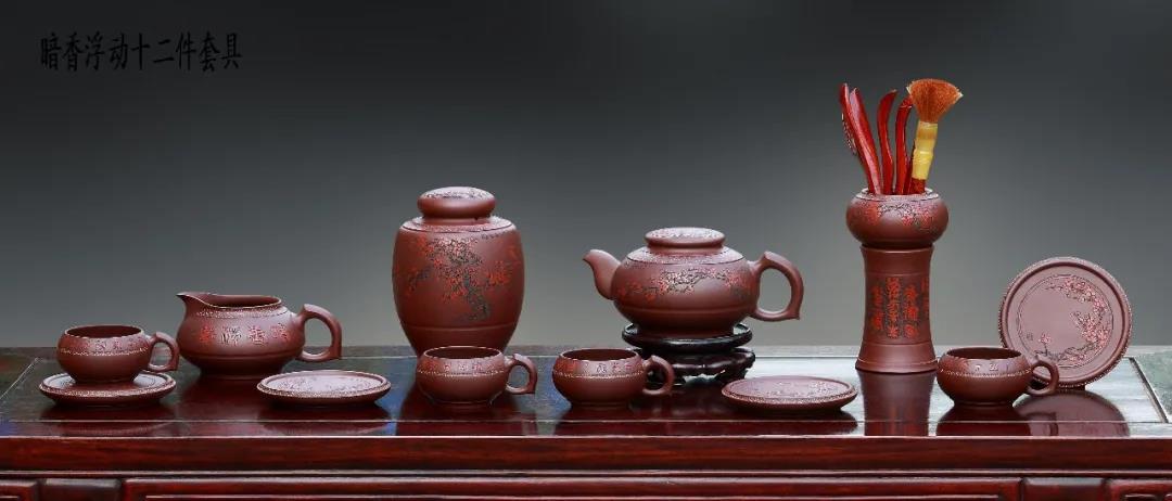 此十二件套壺,以壺、杯、盤、罐組成,造型設(shè)計(jì)新穎別致,線條流暢,簡約大方。套件以北宋林和靖的《山園小梅》——“疏影橫斜水清淺,暗香浮動(dòng)月黃昏”的畫面為主題,梅花入景,運(yùn)用紫砂泥、紅泥,本山泥、紫泥等五色交替表現(xiàn)梅枝的疏密穿插,花朵的正反爭相綻放,疏密有致,散發(fā)出濃郁的傳統(tǒng)文人意趣,氣韻生動(dòng),令人百轉(zhuǎn)回味。
