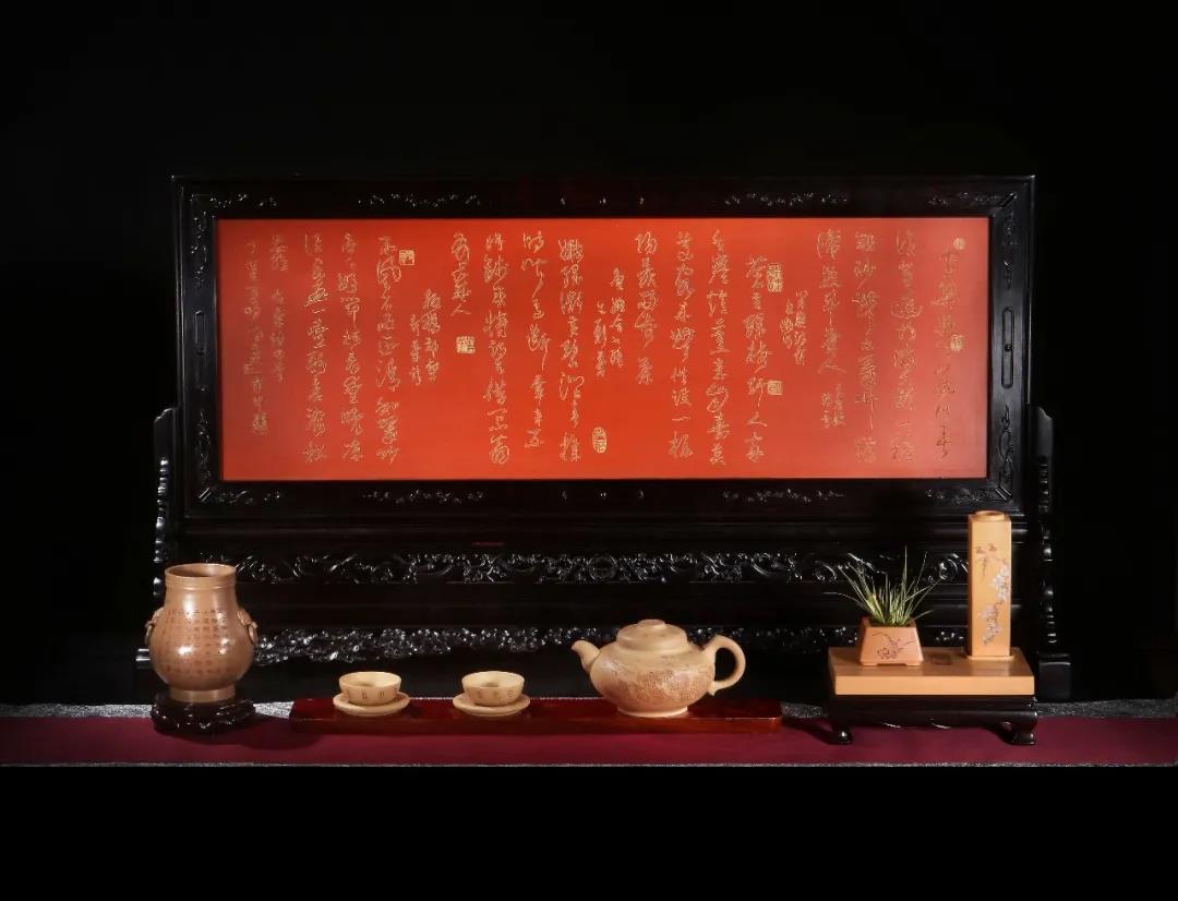 作品采用段泥材質(zhì),造型生動(dòng)傳神,清新樸茂、洗煉明快,簡潔而雅致,富有內(nèi)涵、真趣。書法插屏造型古樸大氣,草書抑揚(yáng)頓挫,縱橫捭闔,節(jié)奏感、韻律感極強(qiáng),與套件相輔相成,渾然一體。