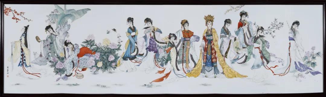 作品是以清代畫家孫溫所繪全本紅樓夢為范本,耗時五年繪制完成的大型釉上瓷版畫作品。作品由245塊瓷板組成,全長245米。作者在保留原畫風(fēng)格的基礎(chǔ)上,對其中的二分之一進行了補充創(chuàng)作,采用了國畫中的工筆繪畫手法,通過陶瓷新彩、粉彩、古彩、墨彩描金等工藝的靈活運用,充分表現(xiàn)了我國明末清初時期復(fù)雜的社會狀況和當(dāng)時青年男女的愛情觀,充滿浪漫色彩和文化情懷。