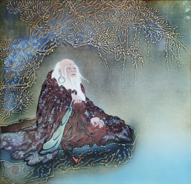 作品采用了顏色釉工藝,描繪了道家創(chuàng)始人、思想家、哲學(xué)家老子端坐潭邊靜心悟道的場景,窯變產(chǎn)生的色彩之無窮變化正符合道家道法自然、玄妙無邊的境界。作品表現(xiàn)手法與內(nèi)容思想契機相合,呈現(xiàn)出極佳的效果。