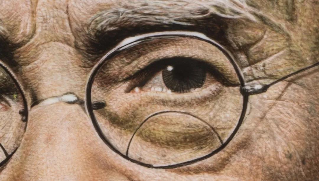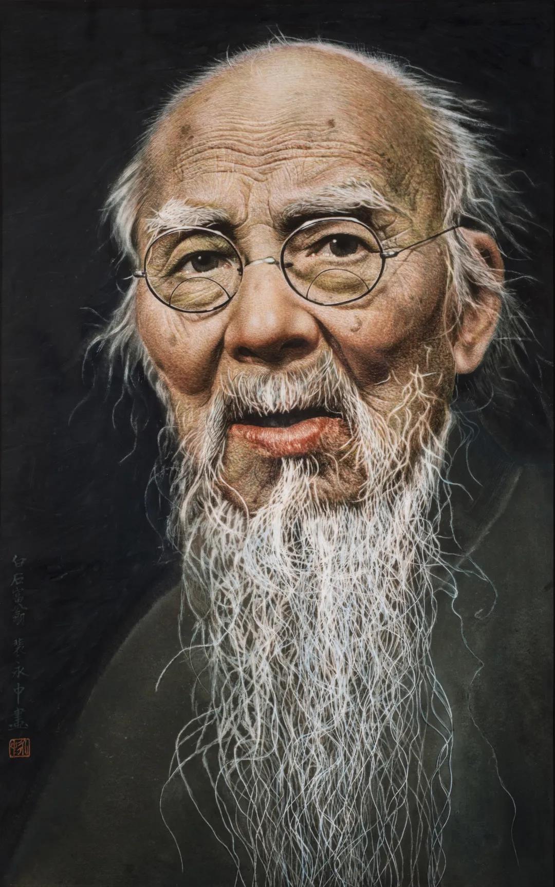 作品以著名繪畫大師齊白石為創(chuàng)作原型,采用粉彩、新彩相結(jié)合的工藝以及中國畫中的線描手法創(chuàng)作的一幅寫實主義作品。白石老人目光深邃,黑色的背景襯托著白石老人滄桑的面容和花白的胡須,一代繪畫大師的風(fēng)采躍然瓷板之上。