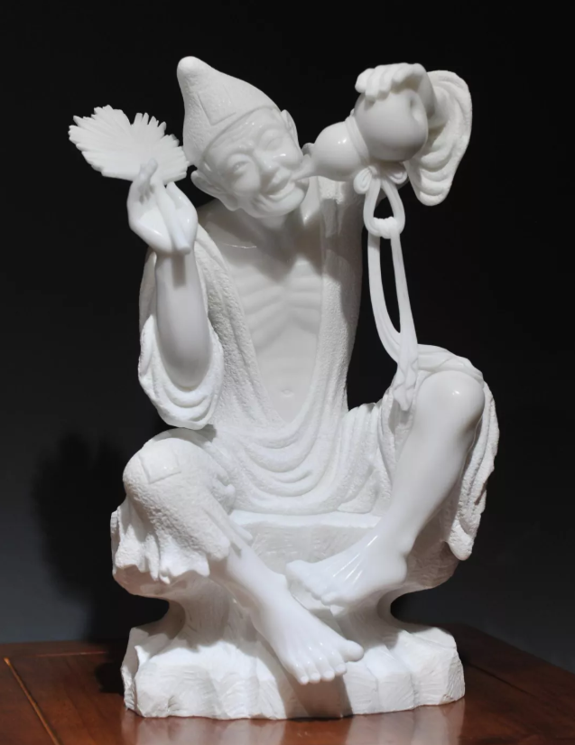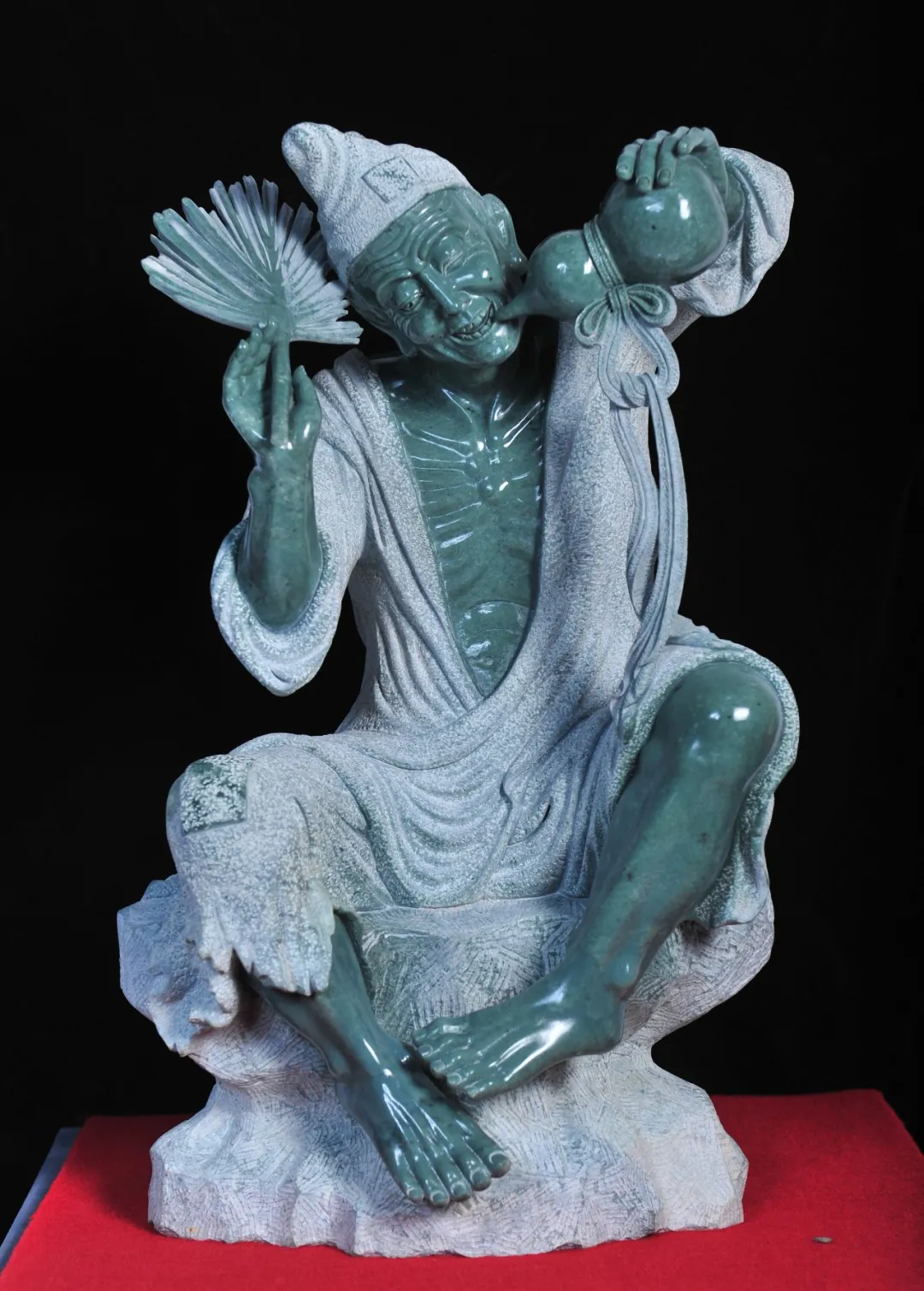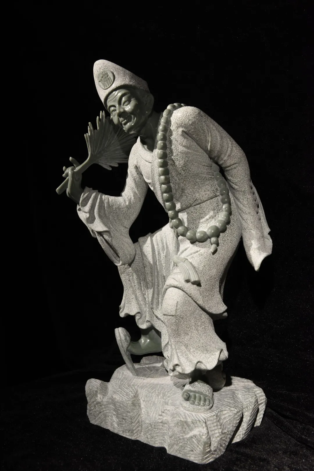 作品以?xún)?yōu)質(zhì)漢白玉為原材料,運(yùn)用粗糙面、光滑面技法處理,塑造了嗜好酒肉、舉止似癡若狂的濟(jì)公形象。濟(jì)公破帽破扇垢衲衣,光著雙腳坐于石頭之上,一手持扇,一手執(zhí)酒葫蘆,歪著腦袋咧開(kāi)嘴,對(duì)著葫蘆做一副想要暢飲的模樣,形象生動(dòng),栩栩如生。