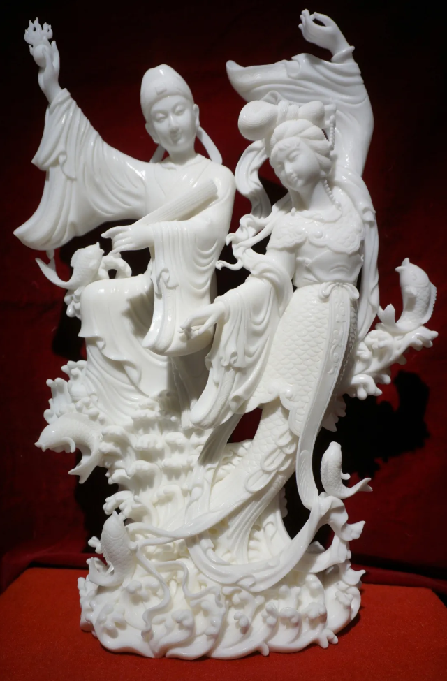 作品以?xún)?yōu)質(zhì)漢白玉為原料,刻畫(huà)了一個(gè)唯美的愛(ài)情故事:碧波仙子與公子白詠歷盡千辛,情定彩虹橋,有情人終成眷屬。