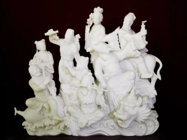 作品用漢白玉群雕塑造了“八仙過(guò)?!边@一家喻戶(hù)曉、膾炙人口的神話(huà)故事。八仙應(yīng)白云大仙之約去間苑赴牡丹會(huì),歸時(shí)路過(guò)東海,他們乘著酒興,各顯神通,浮海而過(guò)。創(chuàng)作者憑借嫻熟的雕刻技法和多年積累的創(chuàng)作經(jīng)驗(yàn),對(duì)八仙的面貌、神情、姿態(tài)、性格及各自神物法器進(jìn)行了比較細(xì)膩的刻畫(huà),使得每個(gè)人物個(gè)性鮮明,神態(tài)各異,栩栩如生。