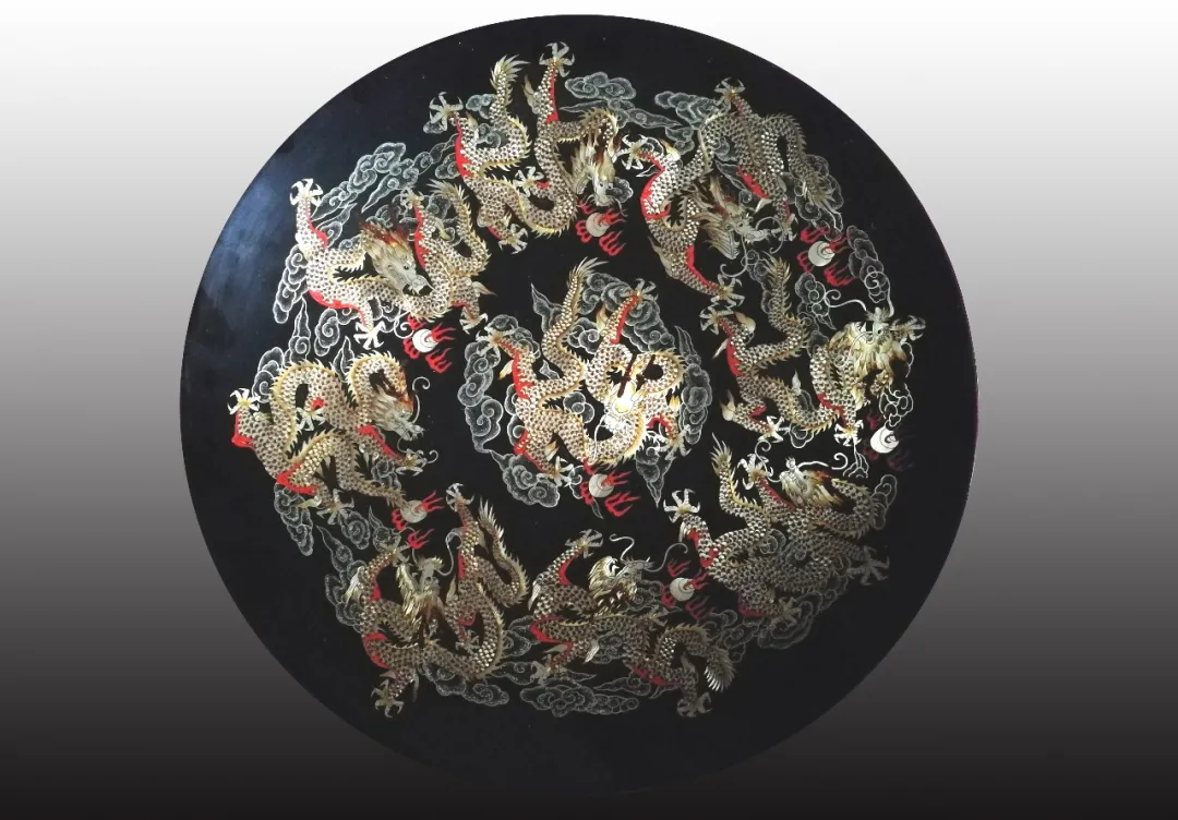 作品以木壓胎,以天然大漆為主要原料,以錫片雕填,絲光彩色為裝飾手法,全手工精制而成。盤中飾以九龍,而九條龍的形體和神態(tài)各異,象征群賢共濟,圓滿如意。作品構圖飽滿,雕工精湛、細膩,十分精致。