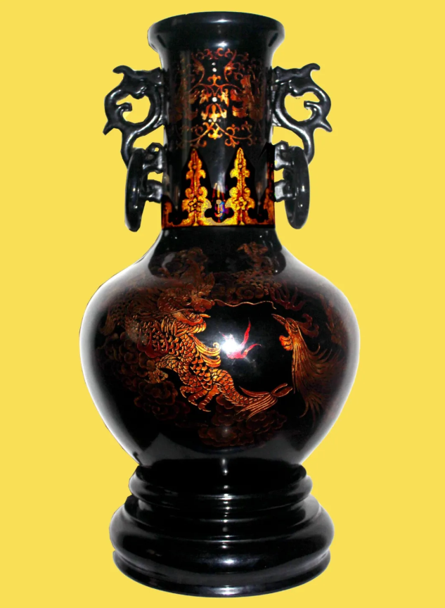 此瓶以楠木為胎,以生漆為原料,利用層次雕漆隱花工藝,經(jīng)數(shù)十道工序全手工精制而成。器型飽滿大方,色澤瑩潤透亮,線條流暢明快,富有層次感。整體畫面華麗大氣,云霧繚繞,騰龍若隱若現(xiàn),神秘中透露出王者氣質,非常震撼。