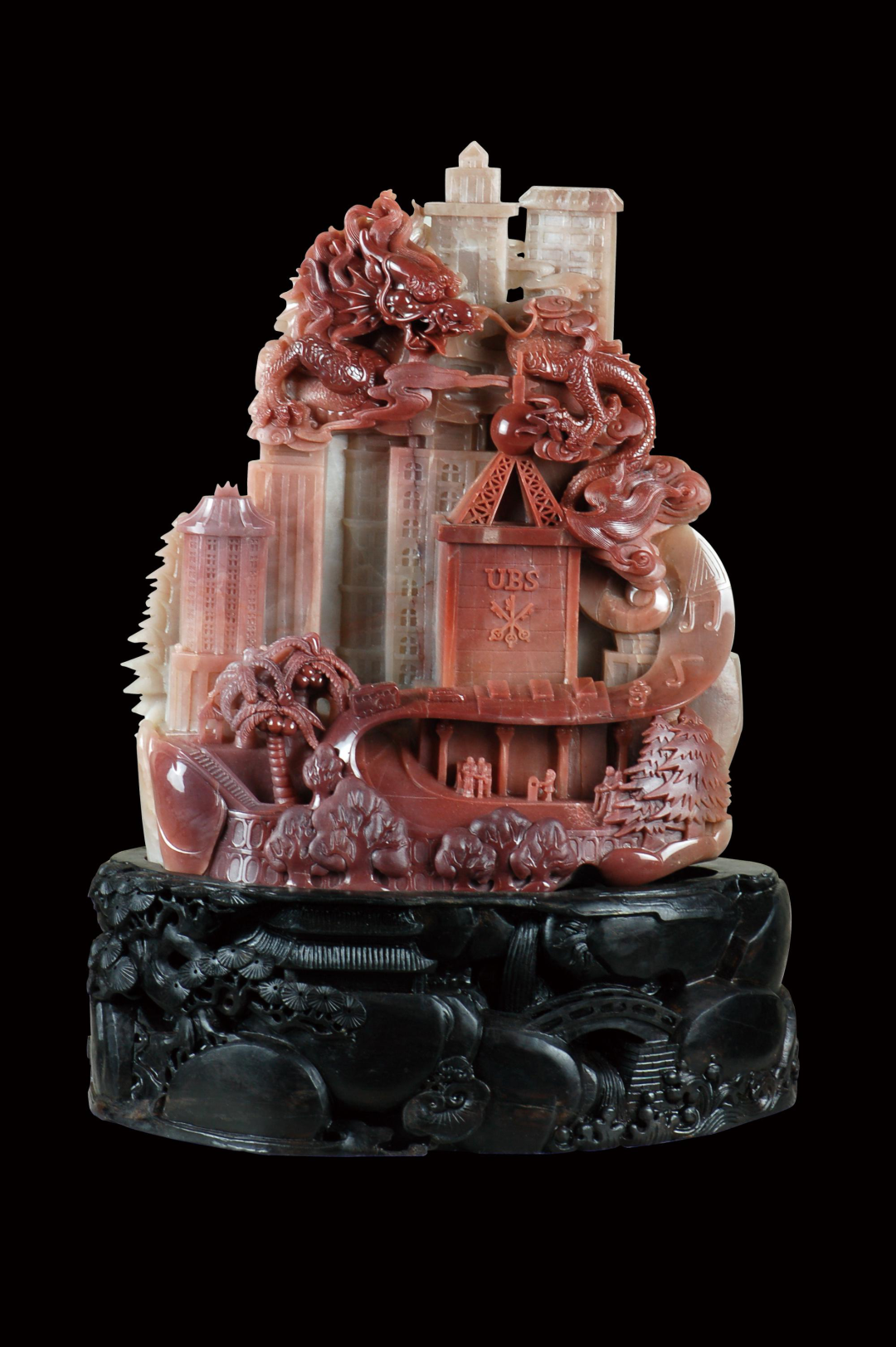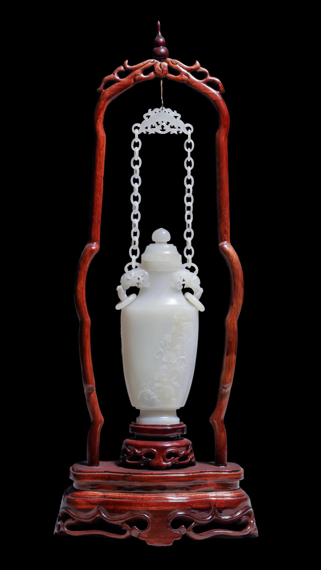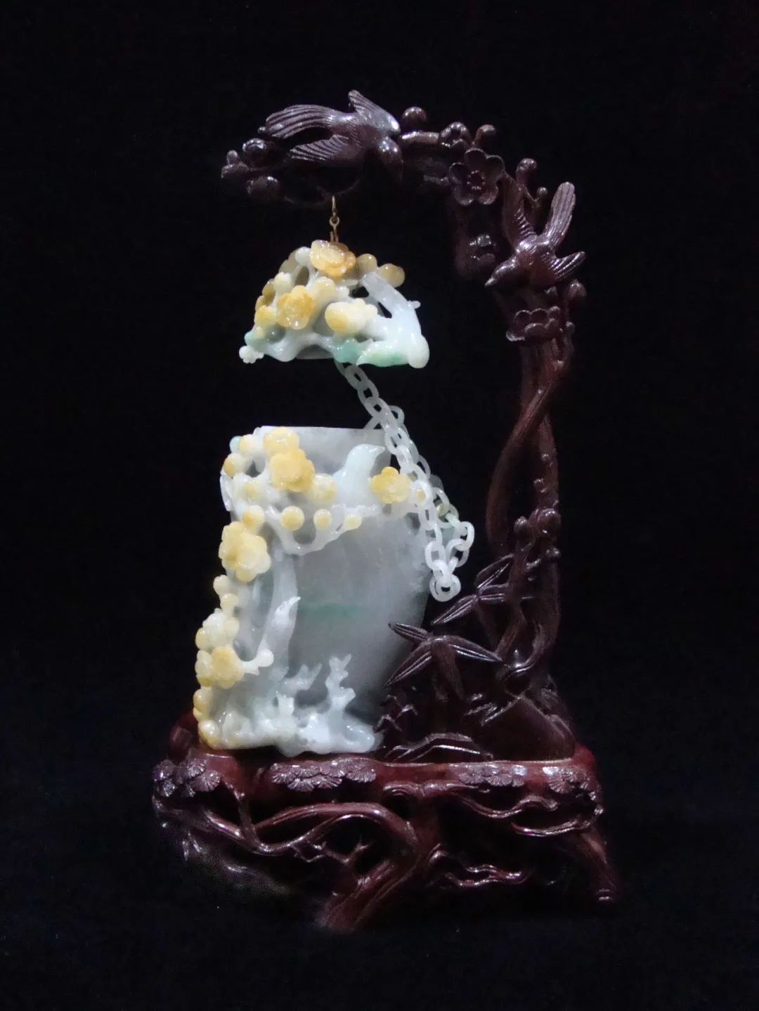 作品在色彩的摘取上獨具匠心,巧用翡翠的天然黃色,將其設(shè)計成傲雪爭艷的梅花,用綠色雕刻成翩翩起舞的喜鵲,瓶內(nèi)的鏈條增加了作品的內(nèi)涵,工藝精細獨到,彰顯了作者的深厚功底。