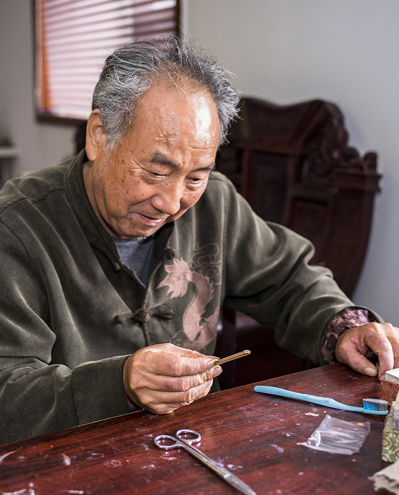 周信興大師的微雕作品在刀法上剛?cè)岵?jì)、遒勁有力,方寸之間盡顯大師氣象;在創(chuàng)作內(nèi)容上博采眾長,師古不泥,名人詩詞、名家畫作兼而有之,行、草、隸、篆、楷各體兼用,微字圓潤俊秀、蒼勁挺拔,微畫簡練明快、栩栩如生,圖文交相呼應(yīng),形神兼?zhèn)?,雅俗共賞;在創(chuàng)作用料上因材施藝,推陳出新,象牙、陶瓷、金屬、玉器、毛發(fā)等各盡其材、各顯其異,還突破微雕作品以象牙為主要材料的傳統(tǒng),用資源豐富的紫竹、檀木,自制紫竹簡、紫木簡進(jìn)行微雕創(chuàng)作,在全國微雕藝術(shù)界獨(dú)樹一幟。