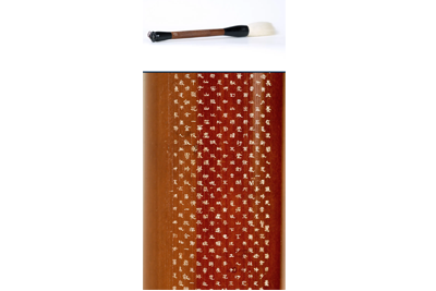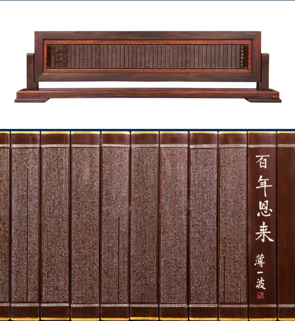紅木木簡微雕《百年恩來》長64.69厘米,寬8厘米,厚0.2厘米。片簡之上容納了20萬字,記錄了周總理的卓著貢獻(xiàn)和不朽人生。白色微字與深色木簡形成了鮮明的對比,給人以強(qiáng)烈的視覺沖擊。