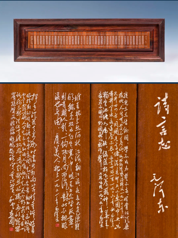 紫竹簡微雕《毛澤東“詩言志”48首》長39.6厘米,寬5.8厘米,厚0.2厘米。作品選用材質(zhì)堅(jiān)韌的紫竹制作成簡,極富歷史感。雄宏灑脫的毛體與大氣磅礴的詩詞交相呼應(yīng),毛主席偉人氣概躍然簡上。