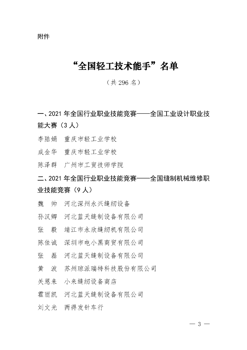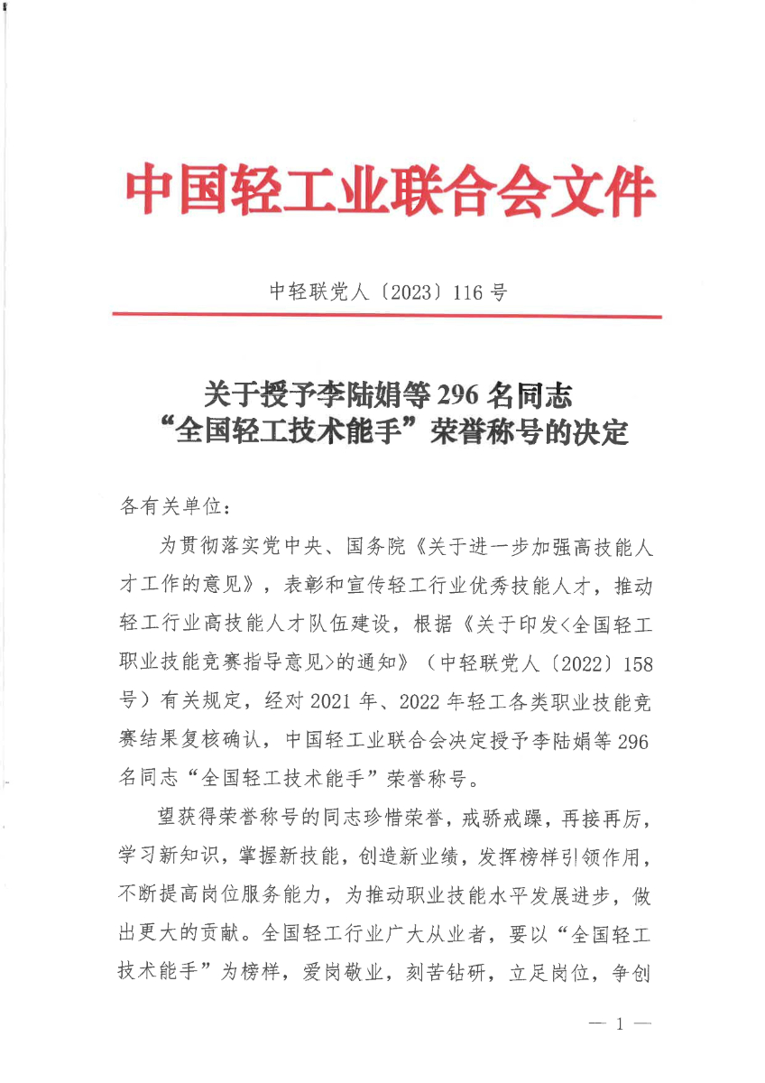 關于授予李陸娟等296名同志“全國輕工技術能手”榮譽稱號的決定