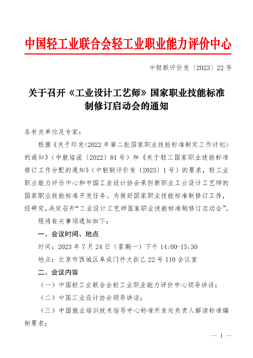 關(guān)于召開《工業(yè)設(shè)計(jì)工藝師》國(guó)家職業(yè)技能標(biāo)準(zhǔn)制修訂啟動(dòng)會(huì)的通知.pdf