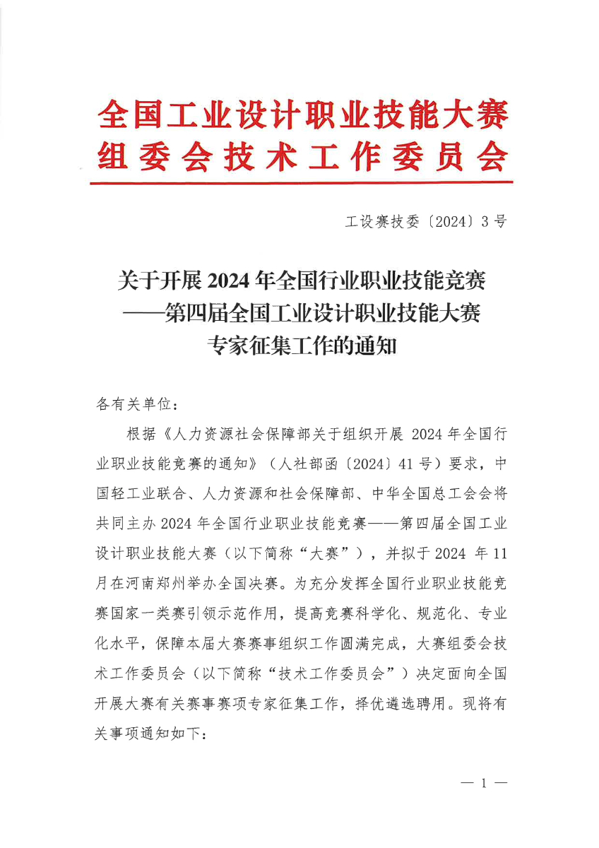 關(guān)于開展2024年第四屆全國工業(yè)設(shè)計職業(yè)技能大賽專家征集工作的通知.pdf