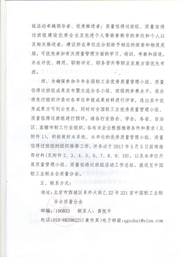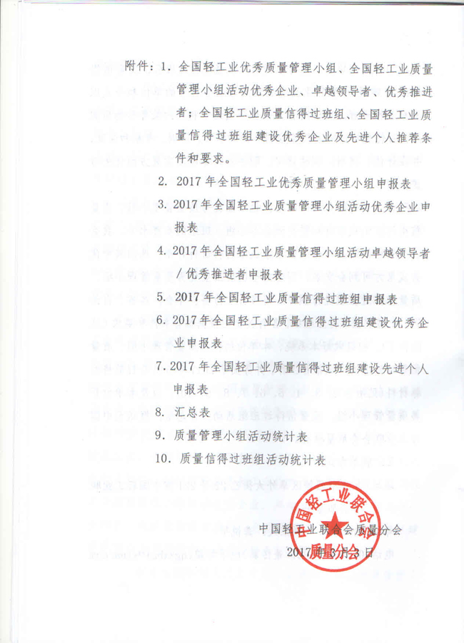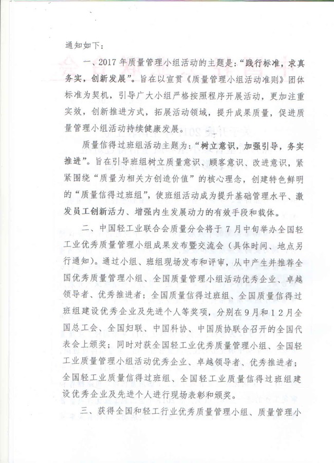 關(guān)于開展2017年全國輕工業(yè)優(yōu)秀質(zhì)量管理小組和質(zhì)量信得過班組評審表彰等系列活動的通知