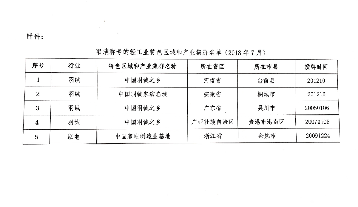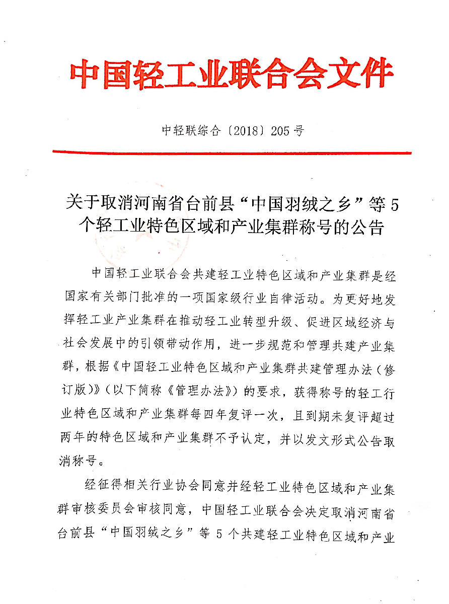 關(guān)于取消河南省臺前縣“中國羽絨之鄉(xiāng)”等5個輕工業(yè)特色區(qū)域和產(chǎn)業(yè)集群稱號的公告