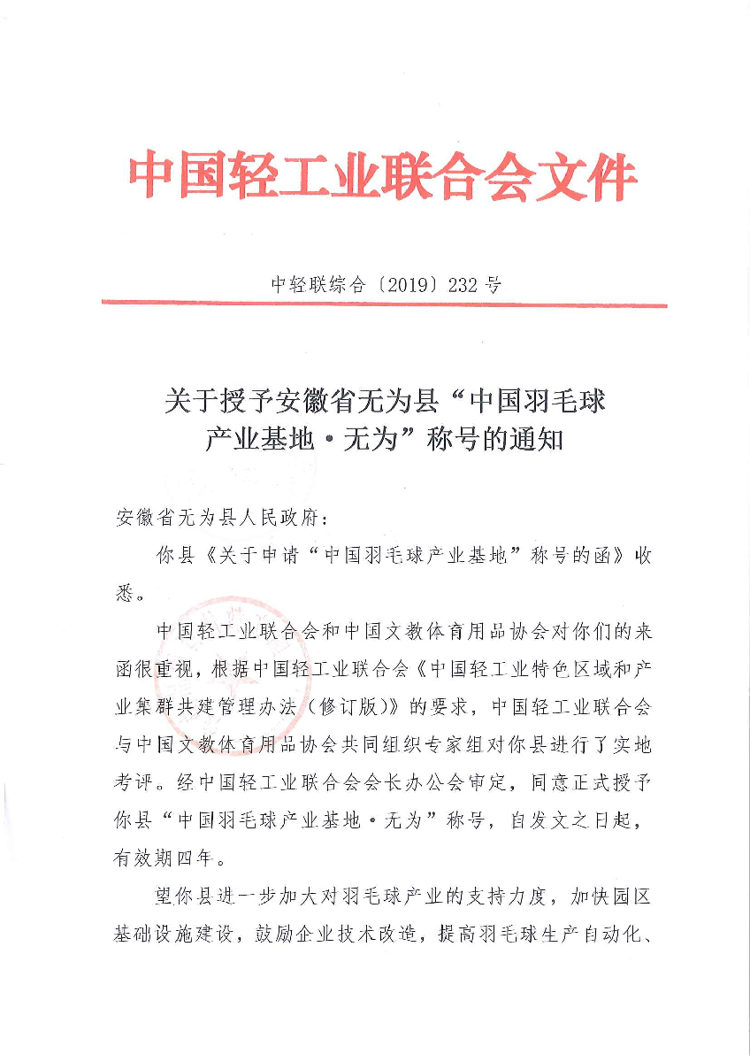 關于授予安徽省無為縣“中國羽毛球產業(yè)基地·無為”稱號的通知