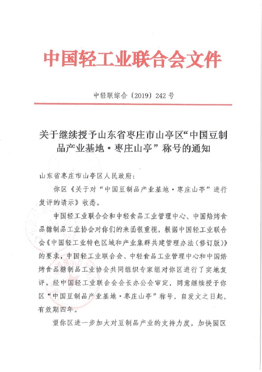 關(guān)于繼續(xù)授予山東省棗莊市山亭區(qū)"中國豆制品產(chǎn)業(yè)基地·棗莊山亭"稱號的通知