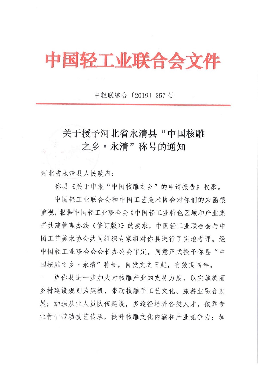 關(guān)于授予河北省永清縣"中國核雕之鄉(xiāng)·永清"稱號的通知