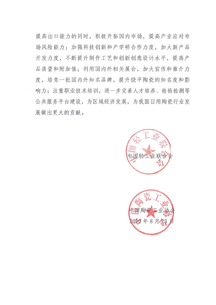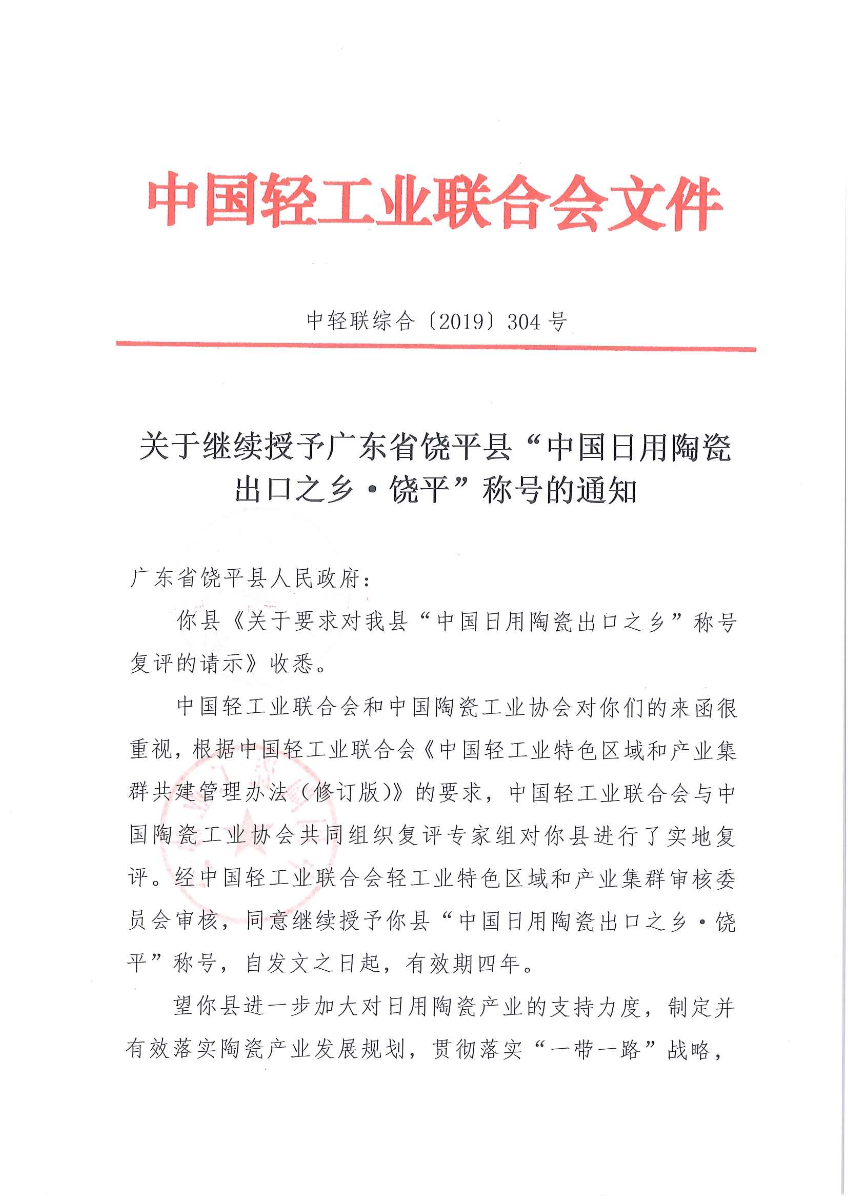 關(guān)于繼續(xù)授予廣東省饒平縣“中國日用陶瓷出口之鄉(xiāng)·饒平”稱號(hào)的通知