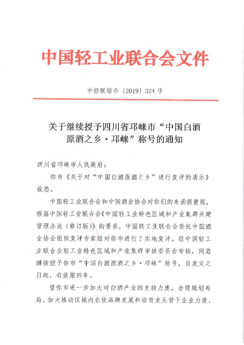 關(guān)于繼續(xù)授予四川省邛崍市“中國白酒原酒之鄉(xiāng)·邛崍”稱號(hào)的通知