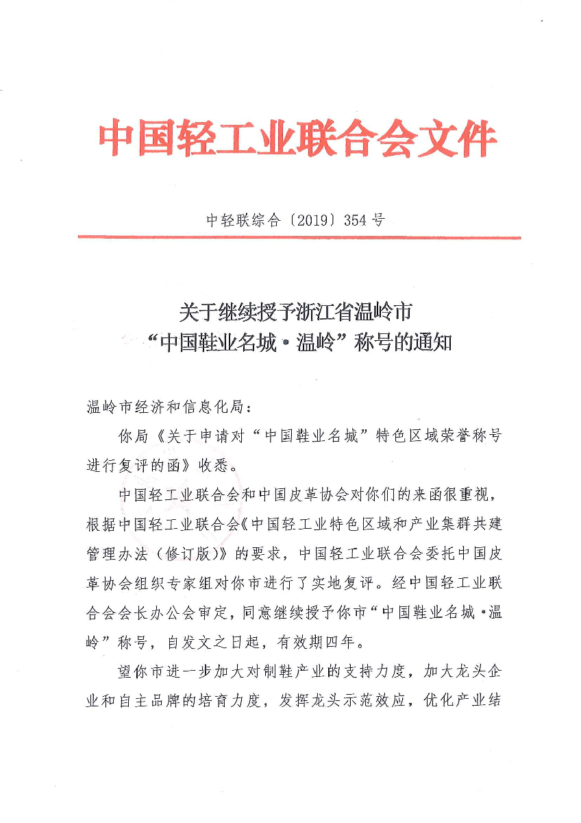 關于繼續(xù)授予浙江省溫嶺市“中國鞋業(yè)名城·溫嶺”稱號的通知