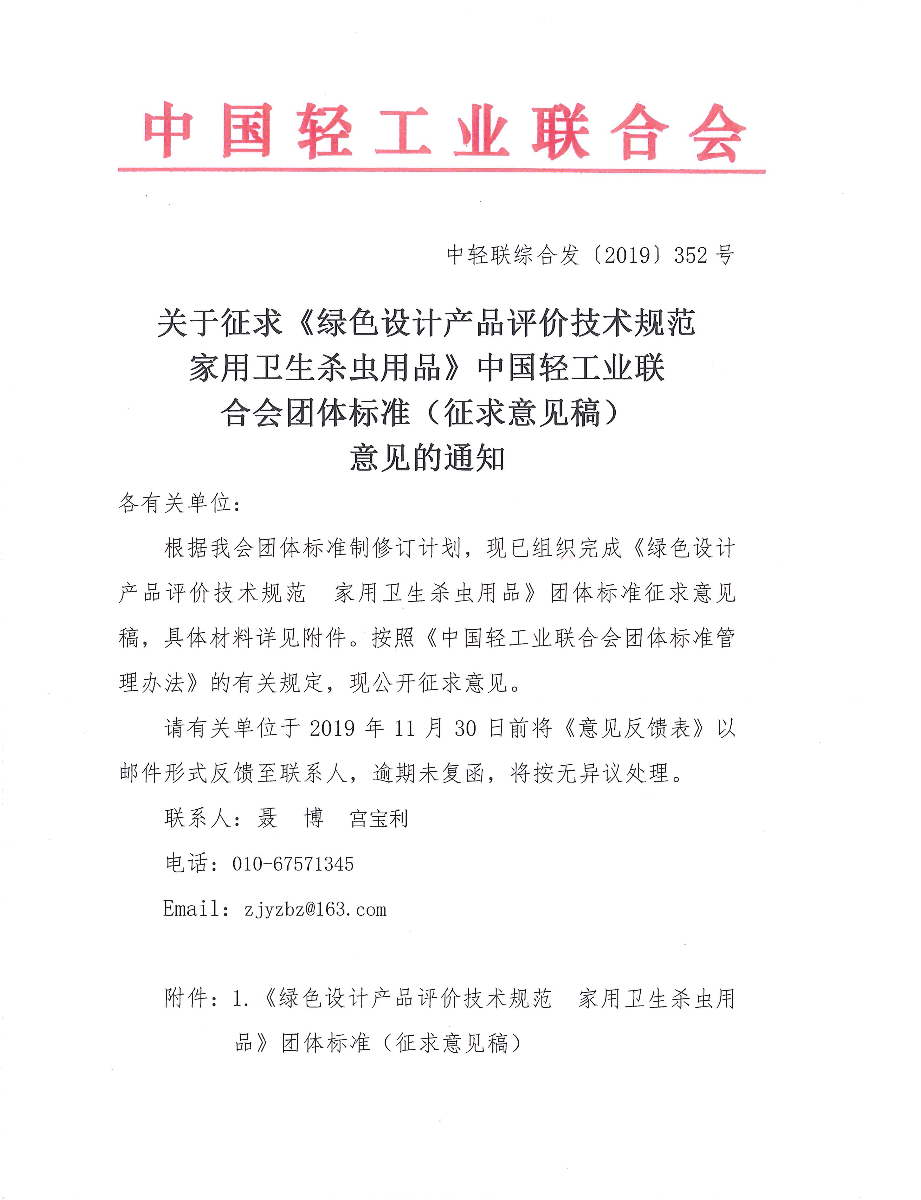關(guān)于征求《綠色設(shè)計(jì)產(chǎn)品評(píng)價(jià)技術(shù)規(guī)范 家用衛(wèi)生殺蟲用品》中國輕工業(yè)聯(lián)合會(huì)團(tuán)體標(biāo)準(zhǔn)(征求意見稿)意見的通知