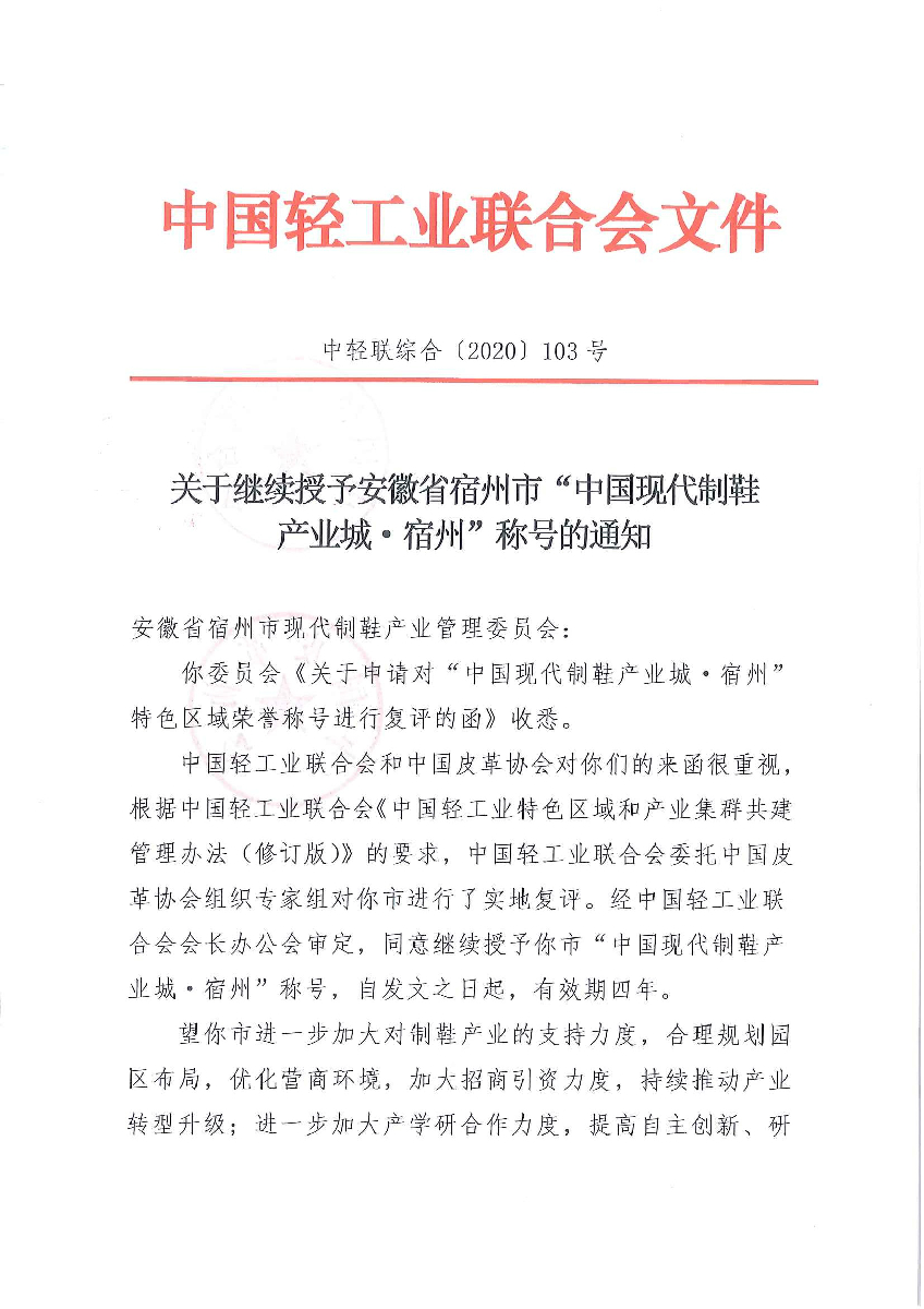 關于繼續(xù)授予安徽省宿州市“中國現代制鞋產業(yè)城·宿州”稱號的通知