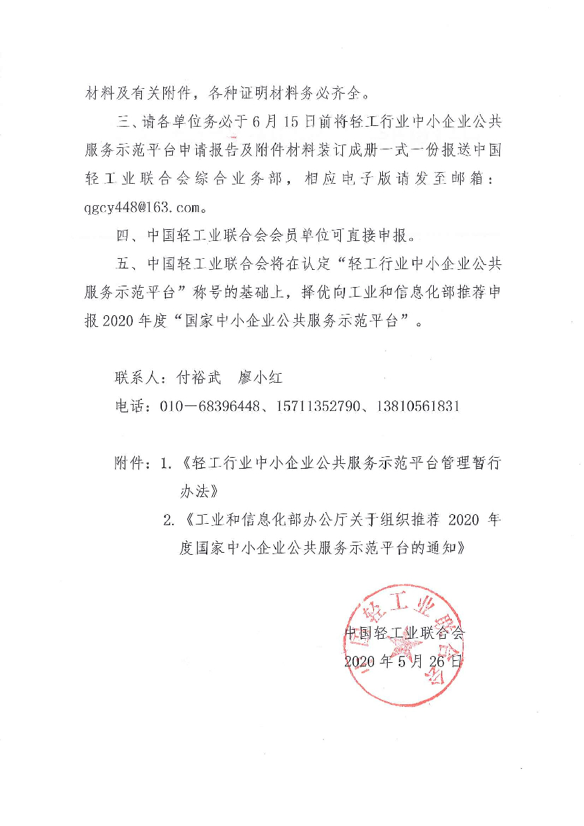 三、請(qǐng)各單位務(wù)必于6月15日前將輕工行業(yè)中小企業(yè)公共服務(wù)示范平臺(tái)申請(qǐng)報(bào)告及附件材料裝訂成冊(cè)一式一份報(bào)送中國(guó)輕工業(yè)聯(lián)合會(huì)綜合業(yè)務(wù)部,相應(yīng)電子版請(qǐng)發(fā)至郵箱:qgcy448@163.com。