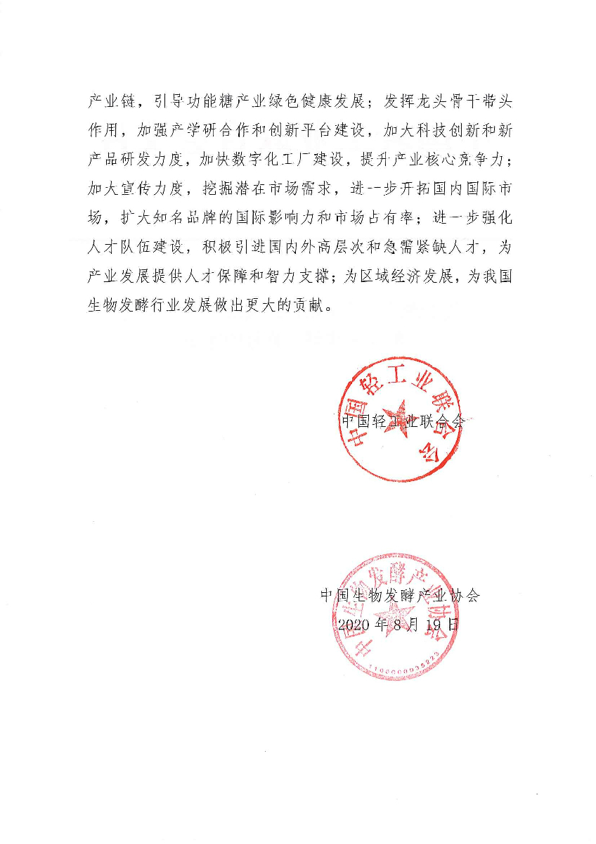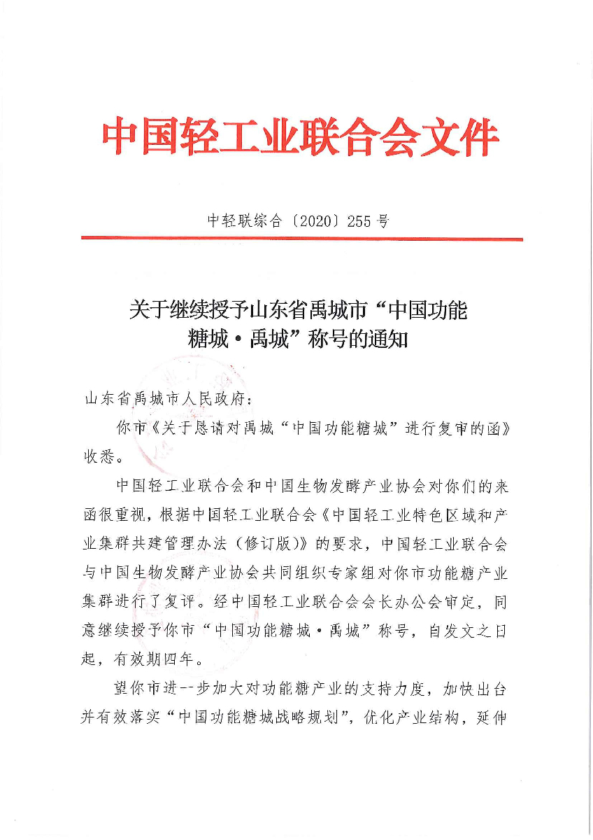 關(guān)于繼續(xù)授予山東省禹城市“中國功能糖城·禹城”稱號的通知