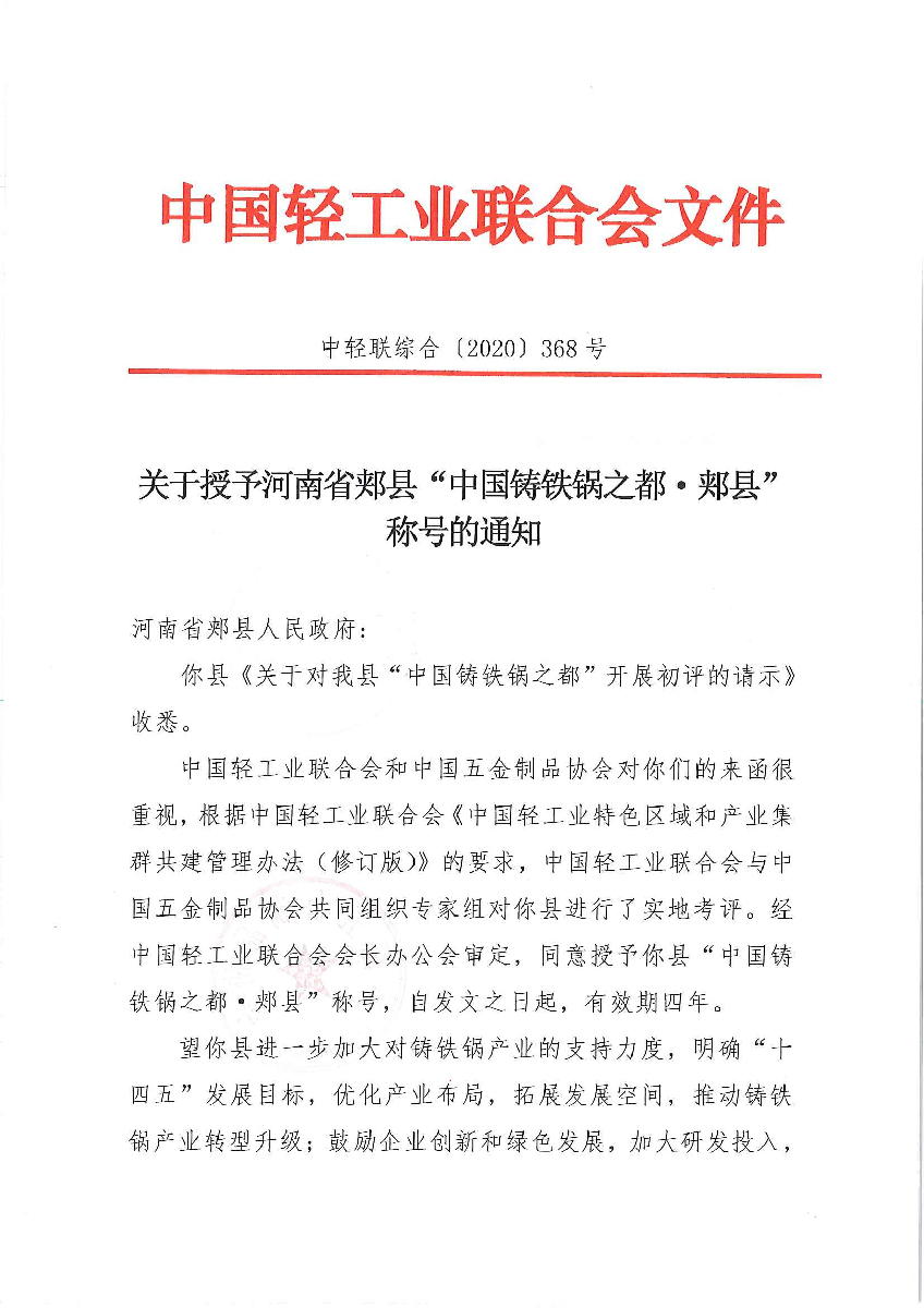 關(guān)于授予河南省郟縣“中國鑄鐵鍋之都·郟縣”稱號的通知