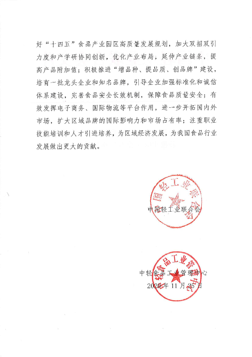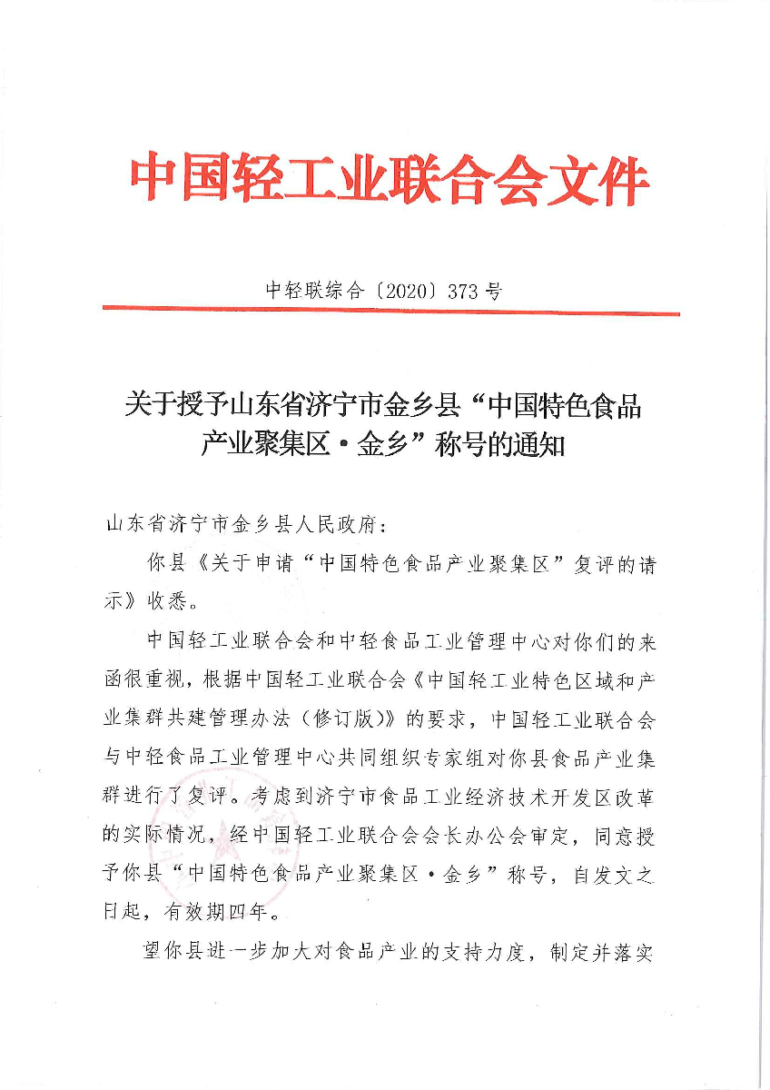 關于授予山東省濟寧市金鄉(xiāng)縣“中國特色食品產業(yè)聚集區(qū)·金鄉(xiāng)”稱號的通知
