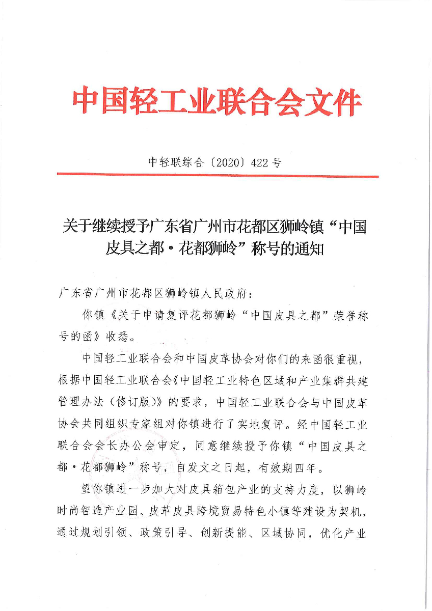 關(guān)于繼續(xù)授予廣東省廣州市花都區(qū)獅嶺鎮(zhèn)“中國(guó)皮具之都·花都獅嶺”稱號(hào)的通知