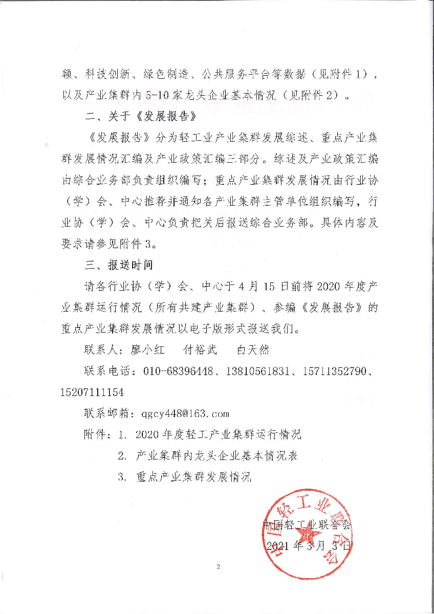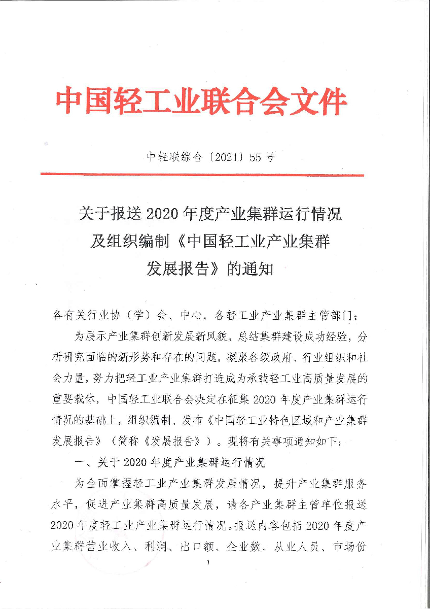 關(guān)于報(bào)送2020年度產(chǎn)業(yè)集群運(yùn)行情況及組織編制《中國輕工業(yè)產(chǎn)業(yè)集群發(fā)展報(bào)告》的通知