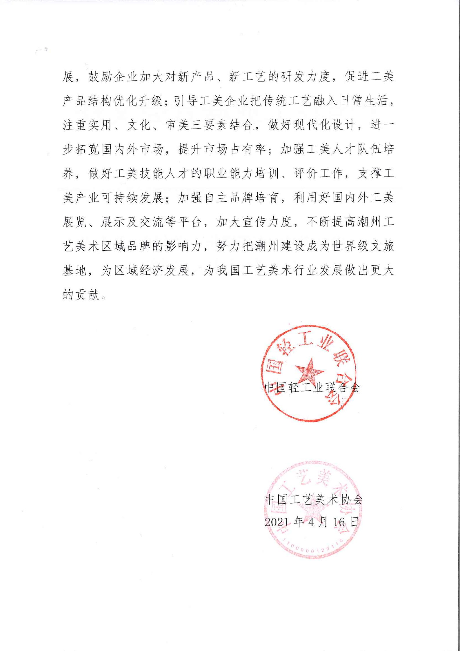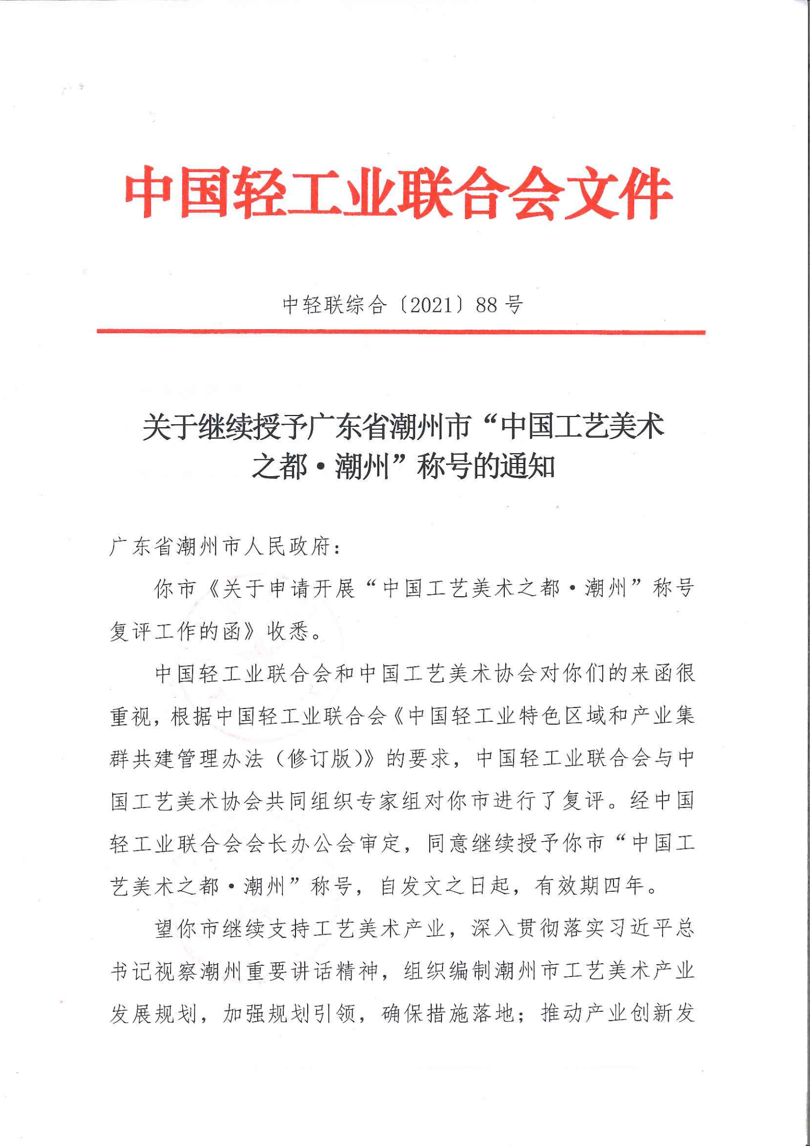 關(guān)于繼續(xù)授予廣東省潮州市“中國工藝美術(shù)之都·潮州”稱號(hào)的通知