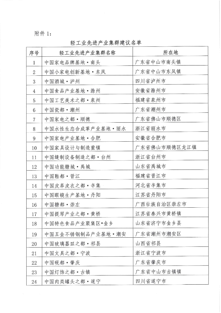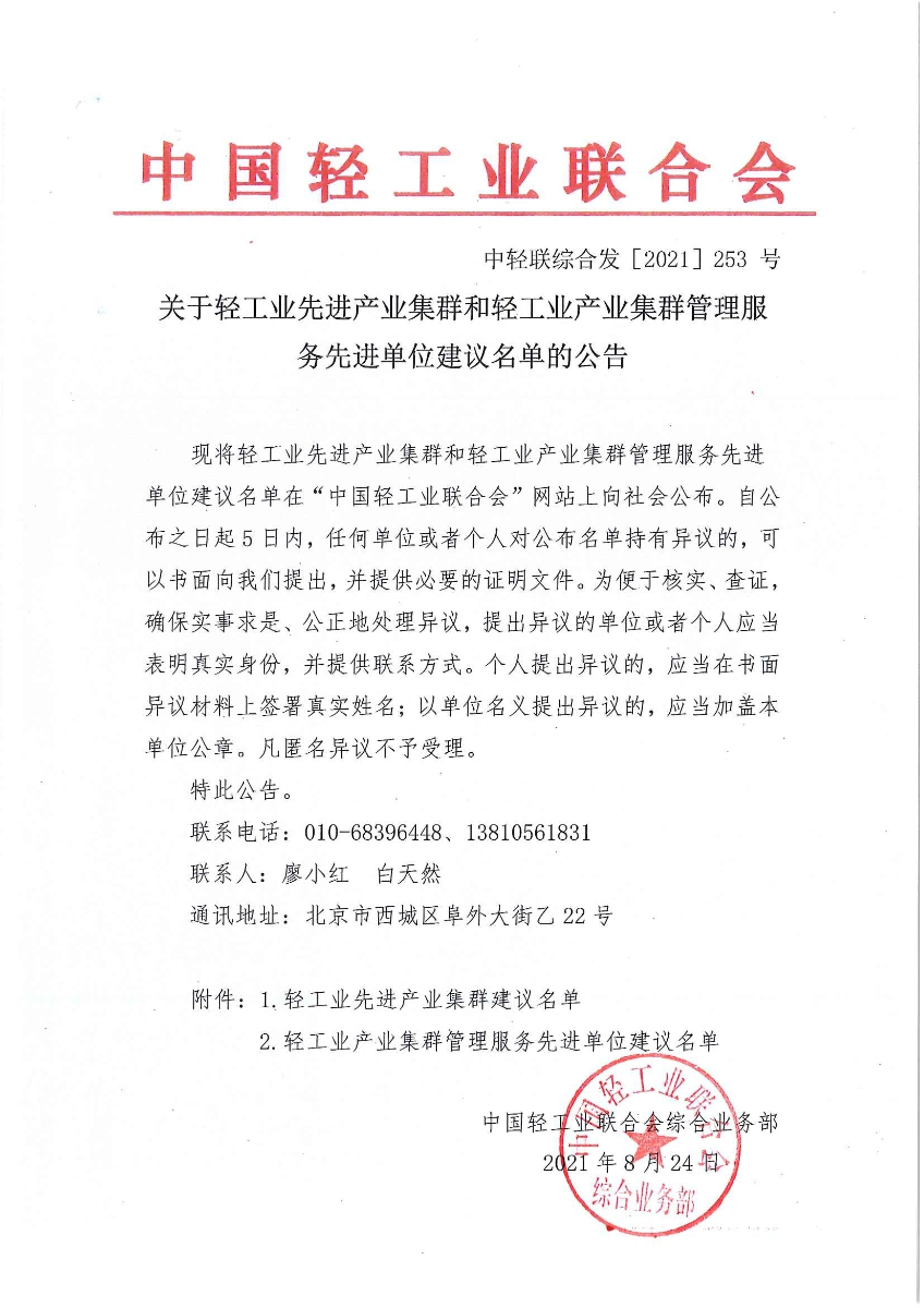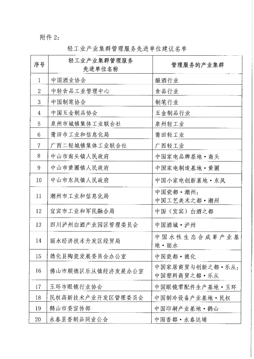 關(guān)于輕工業(yè)先進(jìn)產(chǎn)業(yè)集群和輕工業(yè)產(chǎn)業(yè)集群管理服務(wù)先進(jìn)單位建議名單的公告