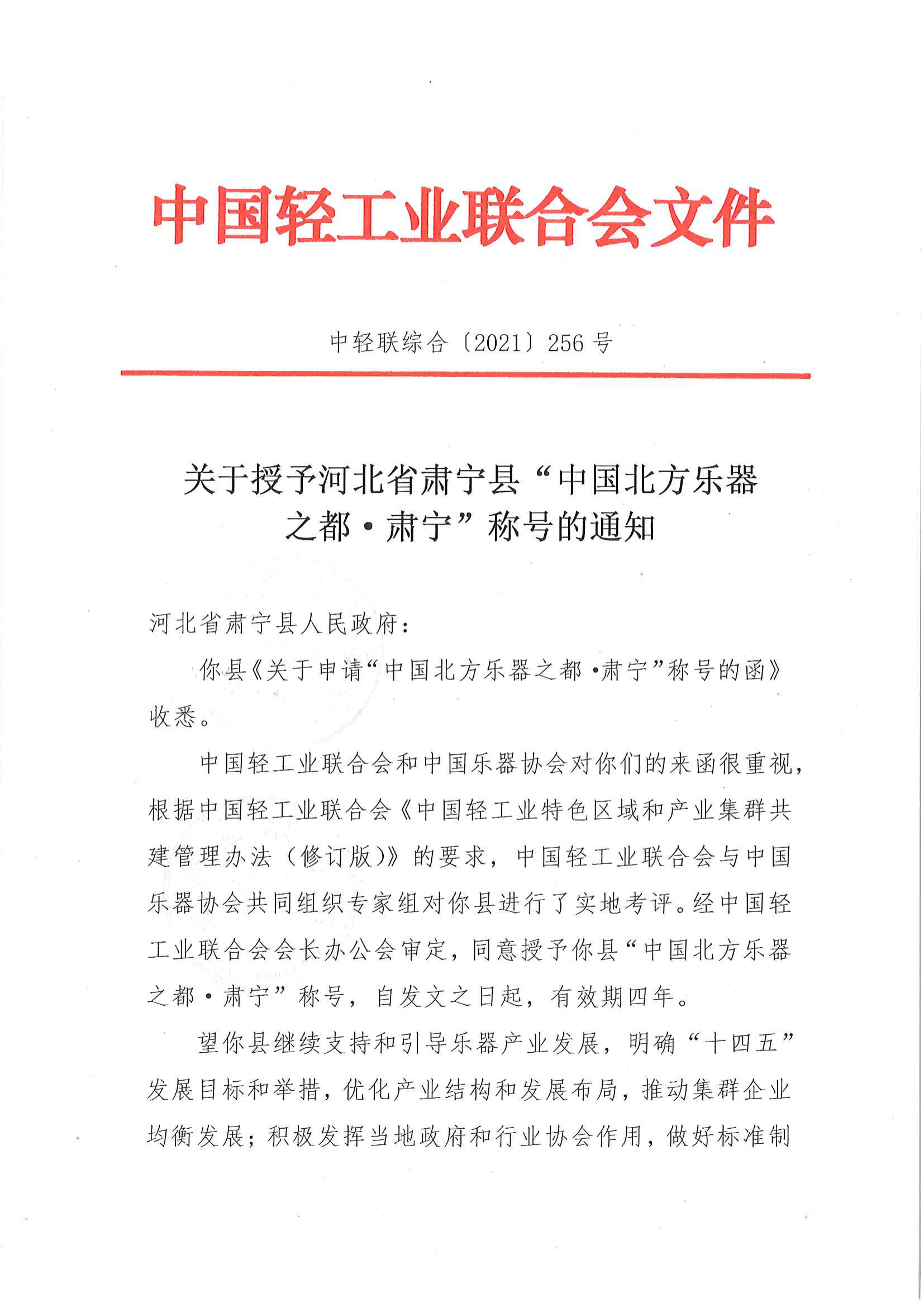 關(guān)于授予河北省肅寧縣“中國北方樂器之都·肅寧”稱號的通知