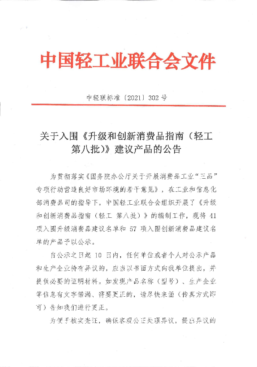關于入圍《升級和創(chuàng)新消費品指南(輕工 第八批)》建議產品的公告