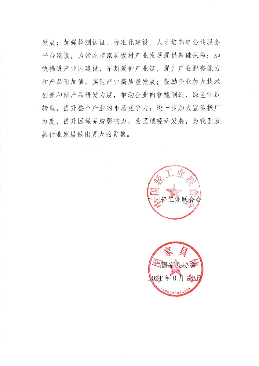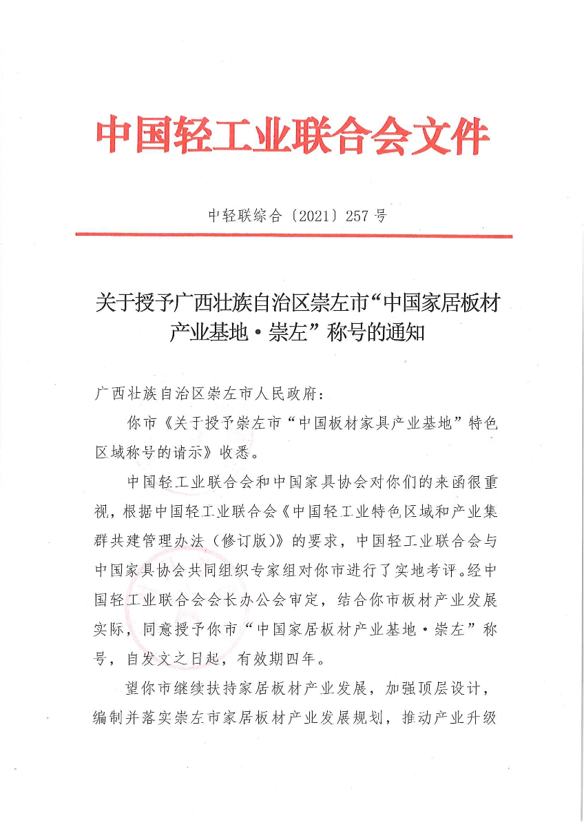 關(guān)于授予廣西壯族自治區(qū)崇左市“中國(guó)家居板材產(chǎn)業(yè)基地·崇左”稱號(hào)的通知