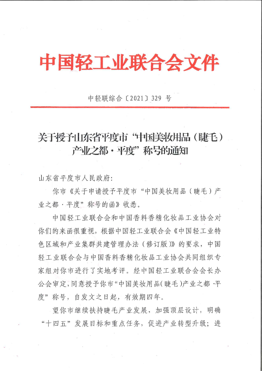 關(guān)于授予山東省平度市“中國美妝用品(睫毛)產(chǎn)業(yè)之都·平度”稱號(hào)的通知