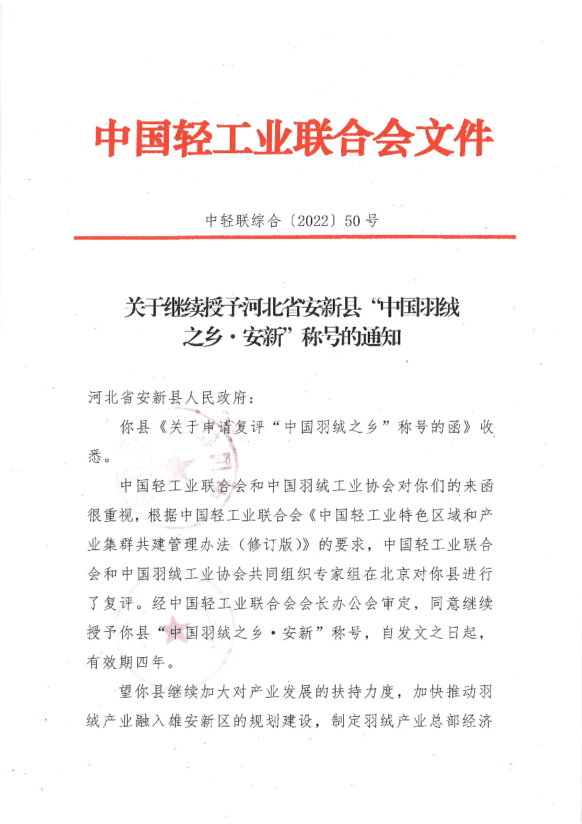 關于繼續(xù)授予河北省安新縣“中國羽絨之鄉(xiāng)·安新”稱號的通知