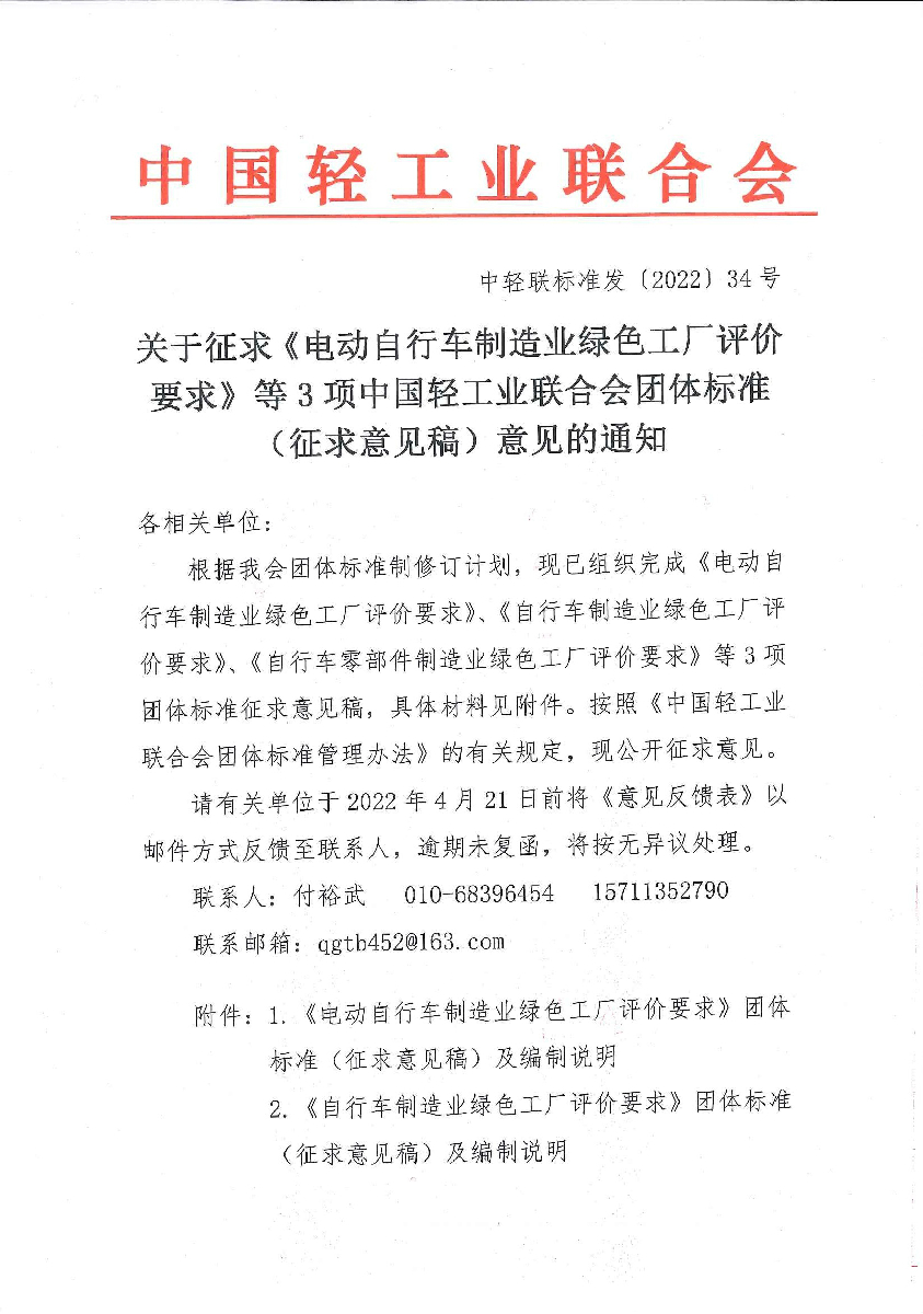 關(guān)于征求《電動(dòng)自行車制造業(yè)綠色工廠評(píng)價(jià)要求》等3項(xiàng)中國(guó)輕工業(yè)聯(lián)合會(huì)團(tuán)體標(biāo)準(zhǔn)(征求意見稿)意見的通知