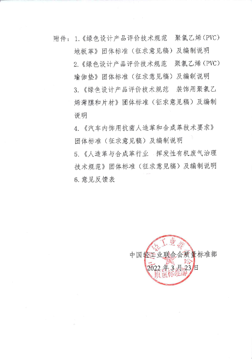 關(guān)于征求《綠色設(shè)計(jì)產(chǎn)品評(píng)價(jià)技術(shù)規(guī)范 聚氯乙烯(PVC)地板革》等5項(xiàng)中國(guó)輕工業(yè)聯(lián)合會(huì)團(tuán)體標(biāo)準(zhǔn)(征求意見稿)意見的通知