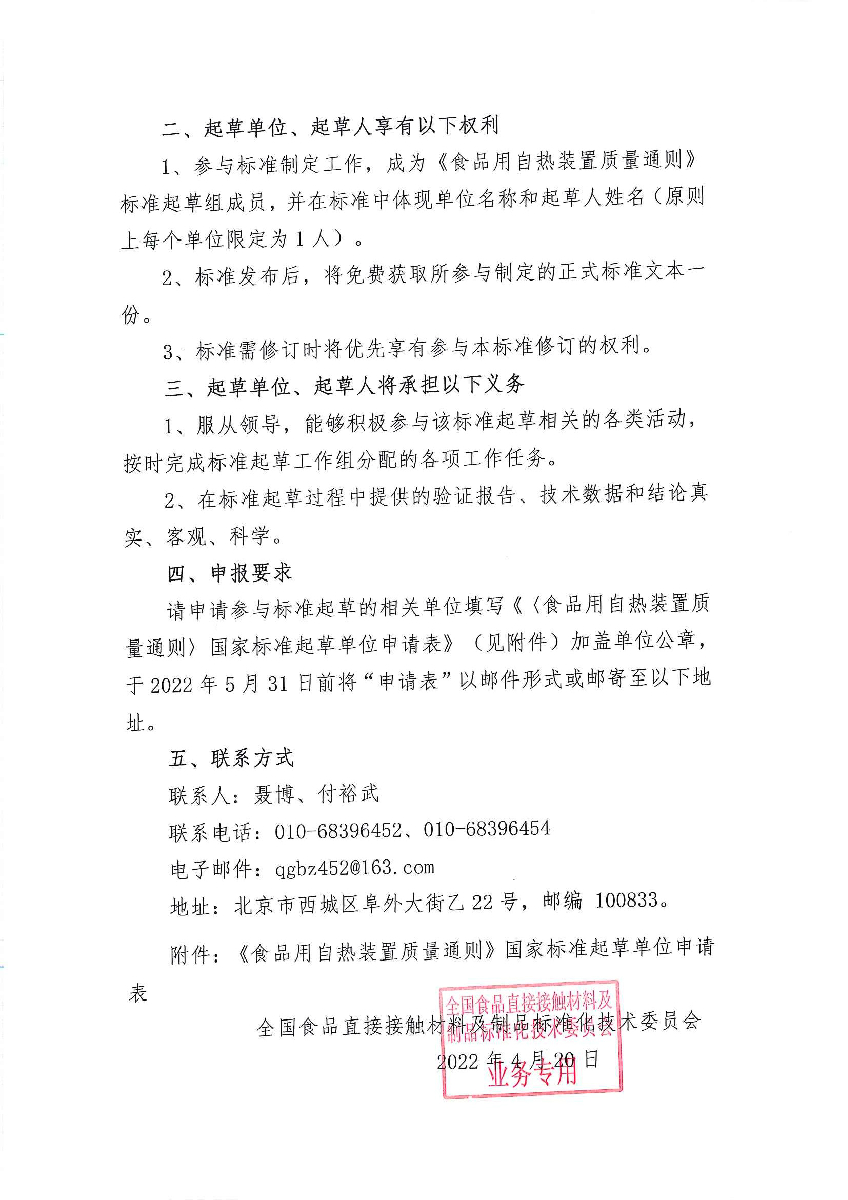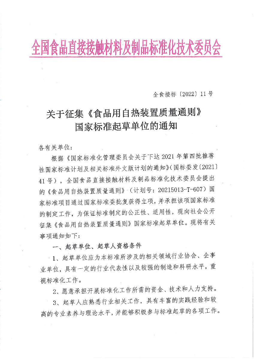 關(guān)于征集《食品用自熱裝置質(zhì)量通則》國(guó)家標(biāo)準(zhǔn)起草單位的通知