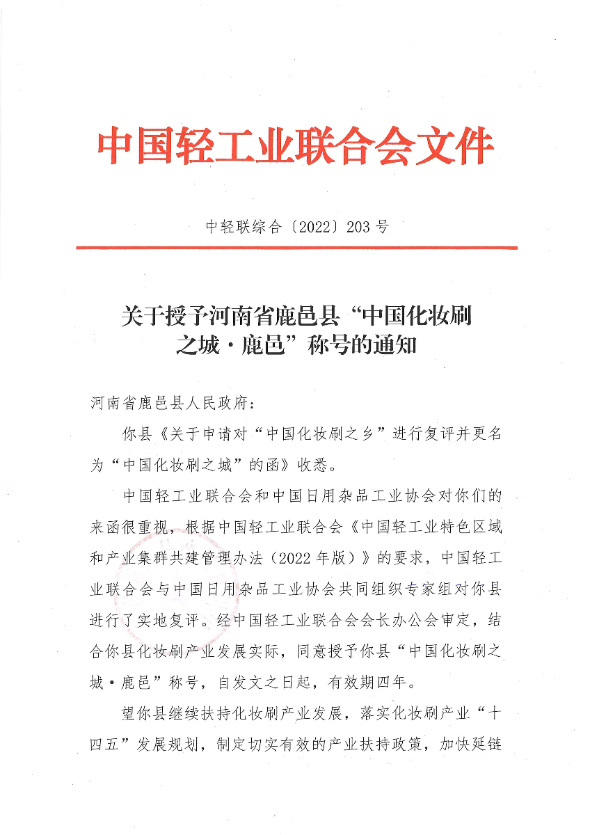 關(guān)于授予河南省鹿邑縣“中國化妝刷之城·鹿邑”稱號(hào)的通知