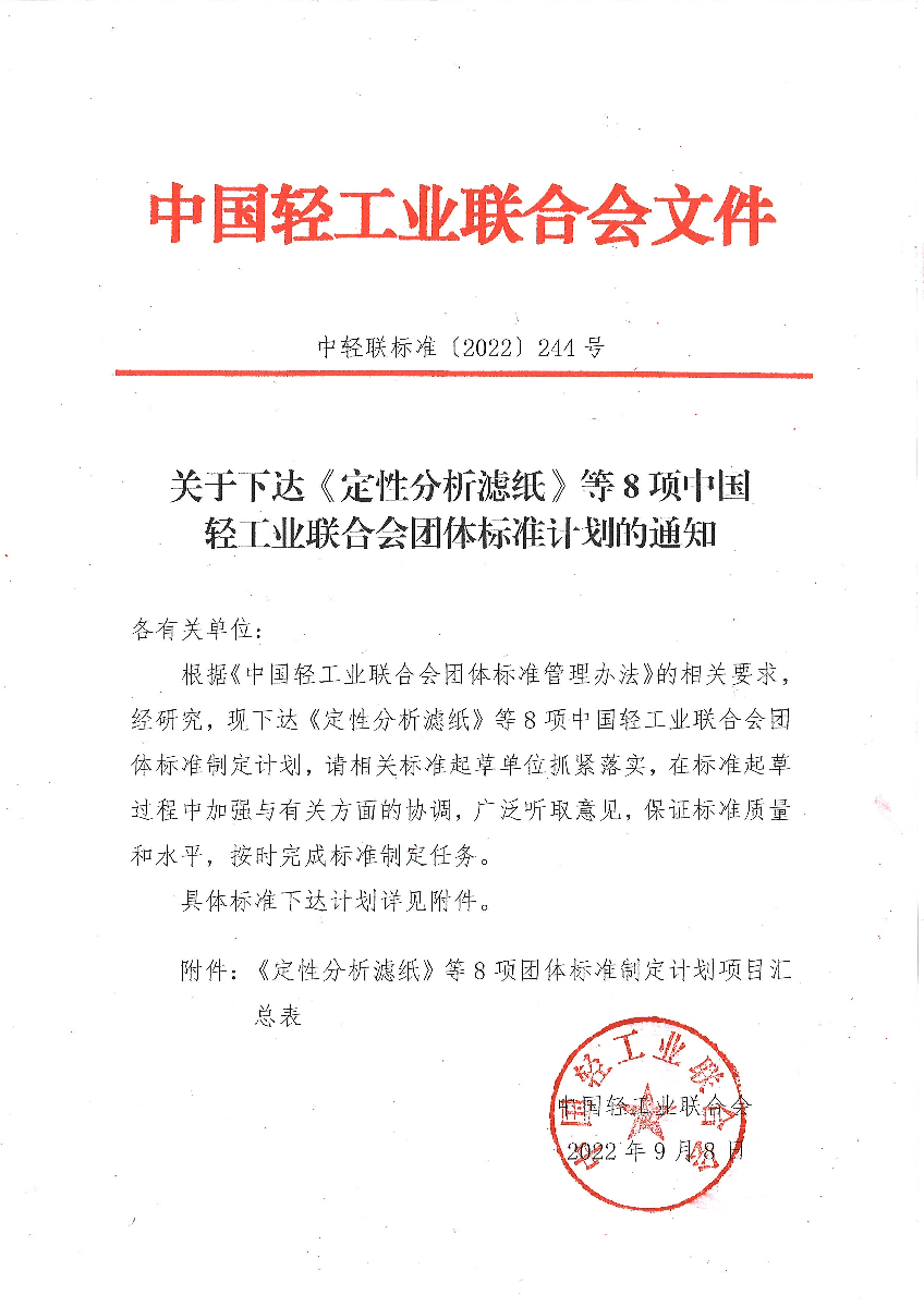 關(guān)于下達(dá)《定性分析濾紙》等8項(xiàng)中國輕工業(yè)聯(lián)合會團(tuán)體標(biāo)準(zhǔn)計劃的通知