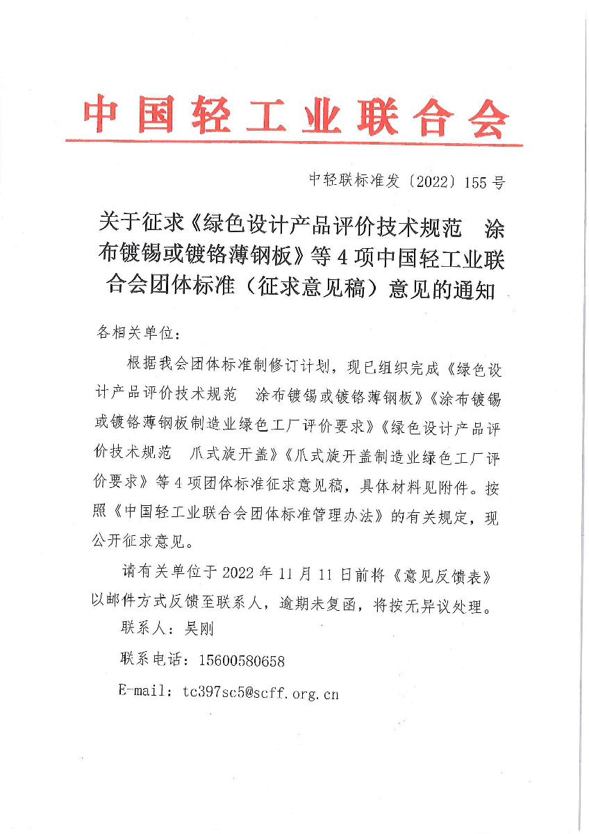 關(guān)于征求《綠色設(shè)計(jì)產(chǎn)品評(píng)價(jià)技術(shù)規(guī)范 涂布鍍錫或鍍鉻薄鋼板》等4項(xiàng)中國(guó)輕工業(yè)聯(lián)合會(huì)團(tuán)體標(biāo)準(zhǔn)(征求意見(jiàn)稿)意見(jiàn)的通知