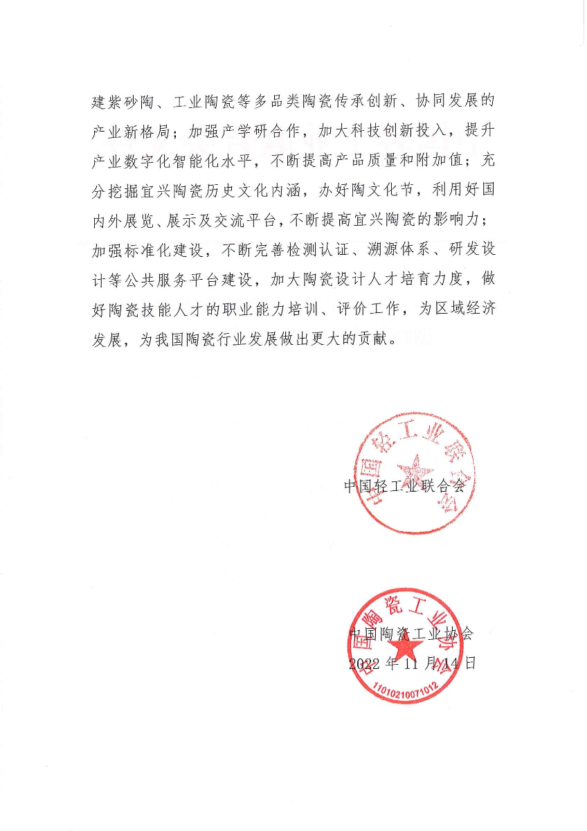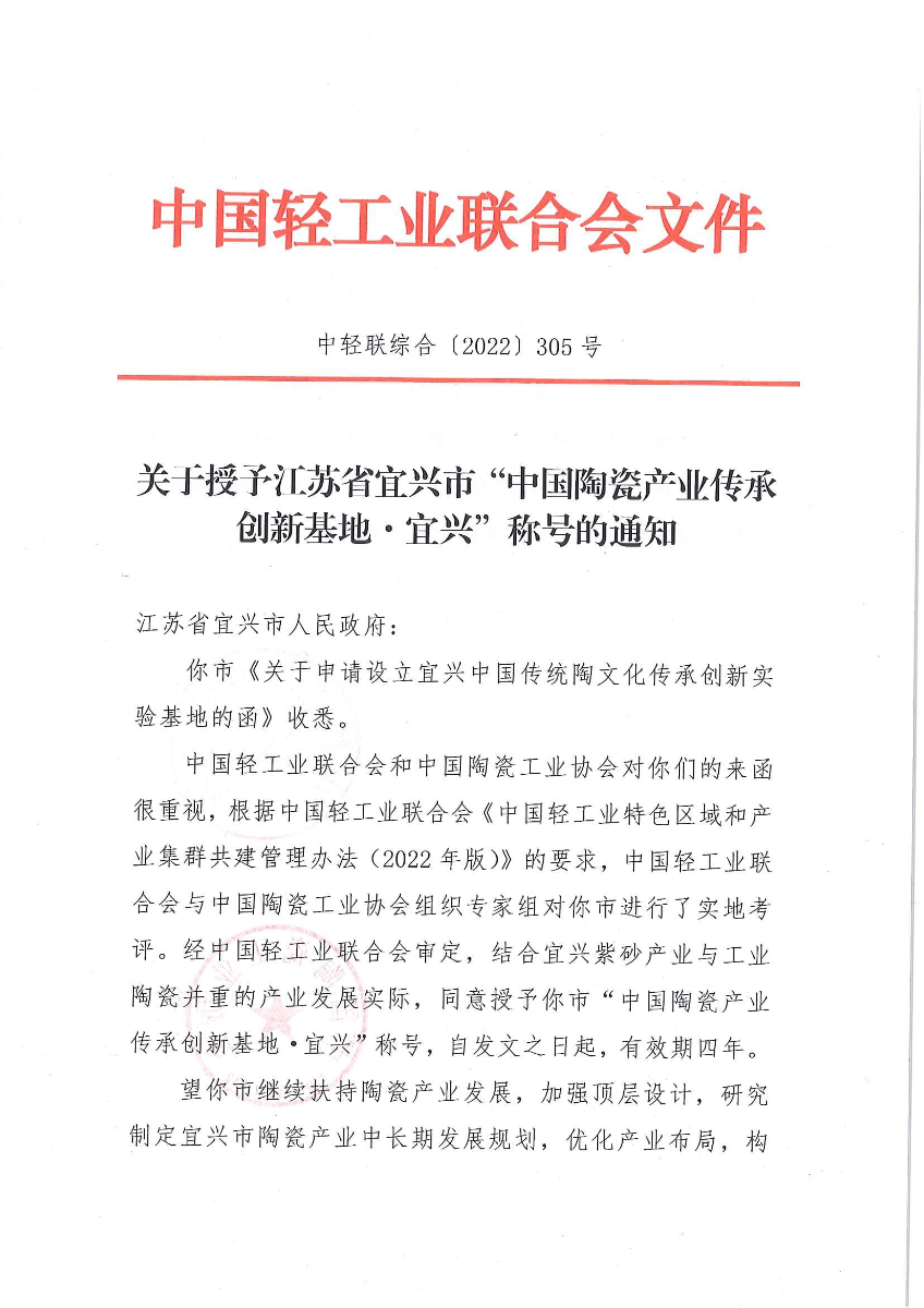 關(guān)于授予江蘇省宜興市“中國陶瓷產(chǎn)業(yè)傳承創(chuàng)新基地·宜興”稱號的通知