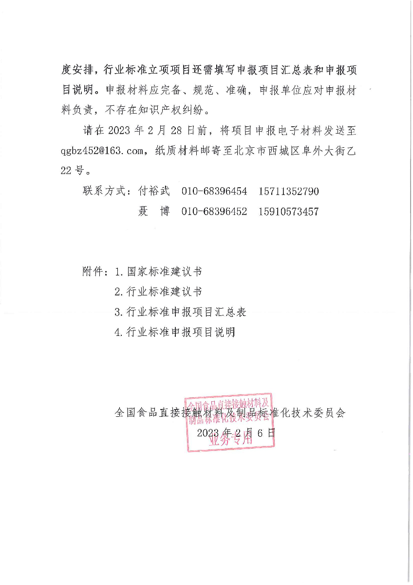 關(guān)于征集2023年食品直接接觸材料及制品領(lǐng)域標(biāo)準(zhǔn)項(xiàng)目的通知