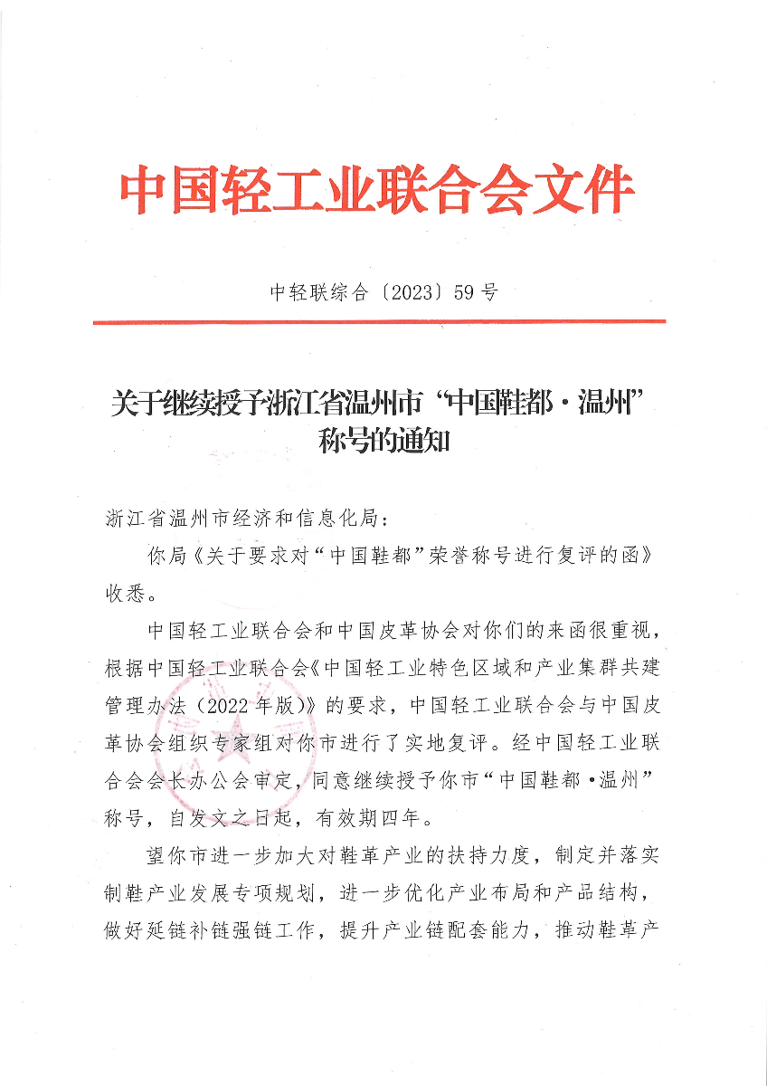 關(guān)于繼續(xù)授予浙江省溫州市“中國鞋都·溫州”稱號的通知